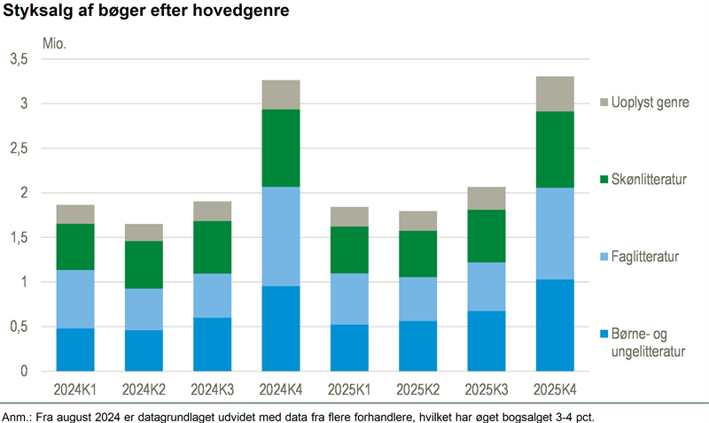 Formålet med statistikken Bogsalg er at belyse udviklingen i styksalg af bøger i Danmark. Statistikken viser udviklingen i antal solgte eksemplarer fra fysiske bogforhandlere og websalg. Statistikken er ny fra 2024 og indeholder oplysninger fra tredje kvartal 2022 og frem.
