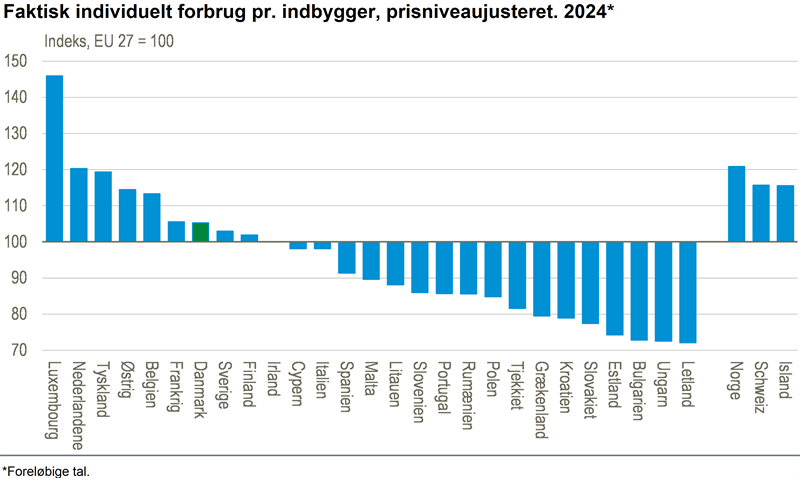 Figuren viser relative prisniveauer i forhold til gennemsnittet for de 27 EU-lande. Indekset kan ikke bruges til at rangordne landene, hvis forskelle landene imellem er mindre end 5 procentpoint, da der er en vis usikkerhed i tallene.