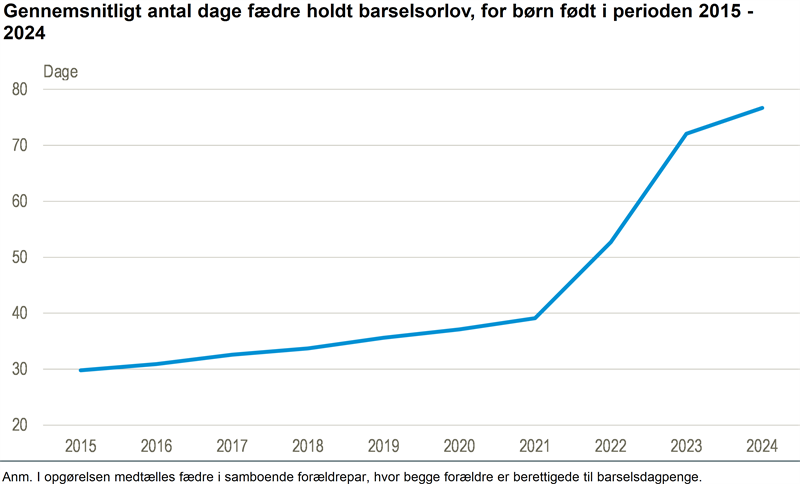 Her kan du se udviklingen i antal dage, hvor mindst én af forældrene har orlov sammen med barnet i løbet af barnets første leveår. Dette gælder kun samboende forældre, hvor begge er berettigede til barselsdagpenge.