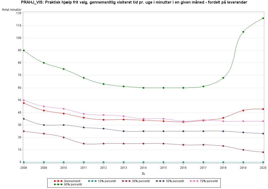 Praktisk hjælp frit valg, gennemsnitlig visiteret tid pr. uge i minutter i en given måned - fordelt på leverandør.Gyldighed