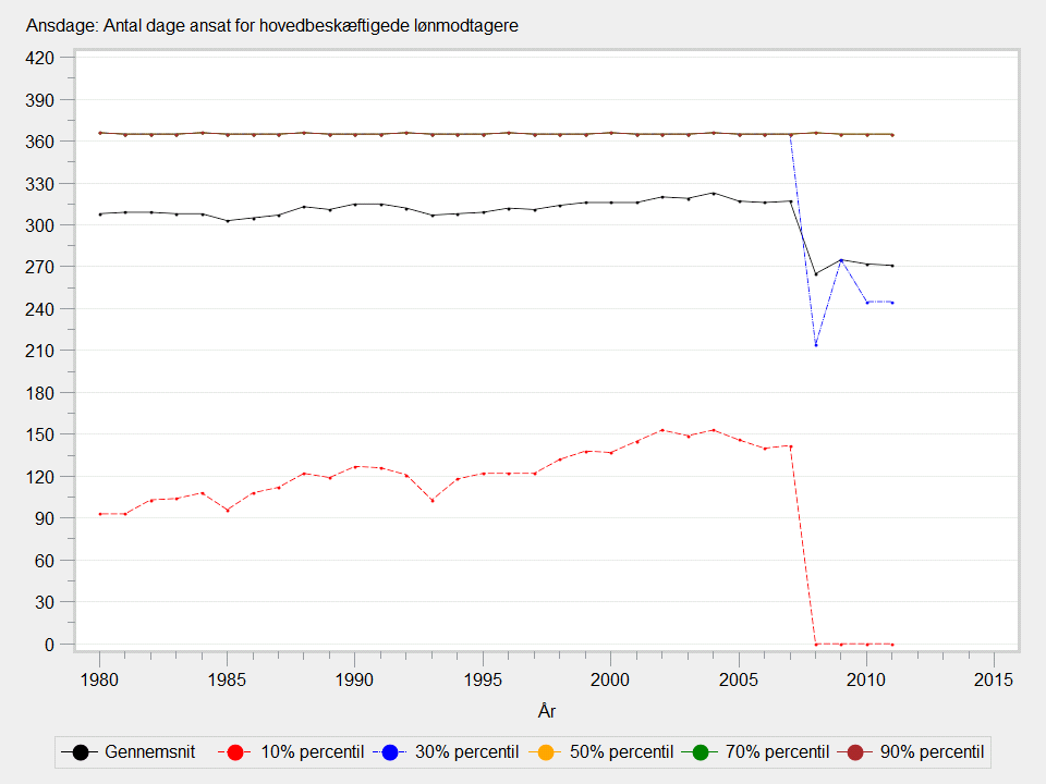 Faldet i antallet af ansættelsesdage i 2008 skyldes at datagrundlaget for lønmodtagerbeskæftigelsen ændres til eIndkomst fra og med IDA2008. Det hidtidige datagrundlag har været det centrale oplysningsseddelregister (KOR). For yderligere information om eIndkomst se emnegruppen Beskæftigelse og herunder statistikområdebeskrivelsen "Befolkningens tilknytning til arbejdsmarkedet (RAS)".