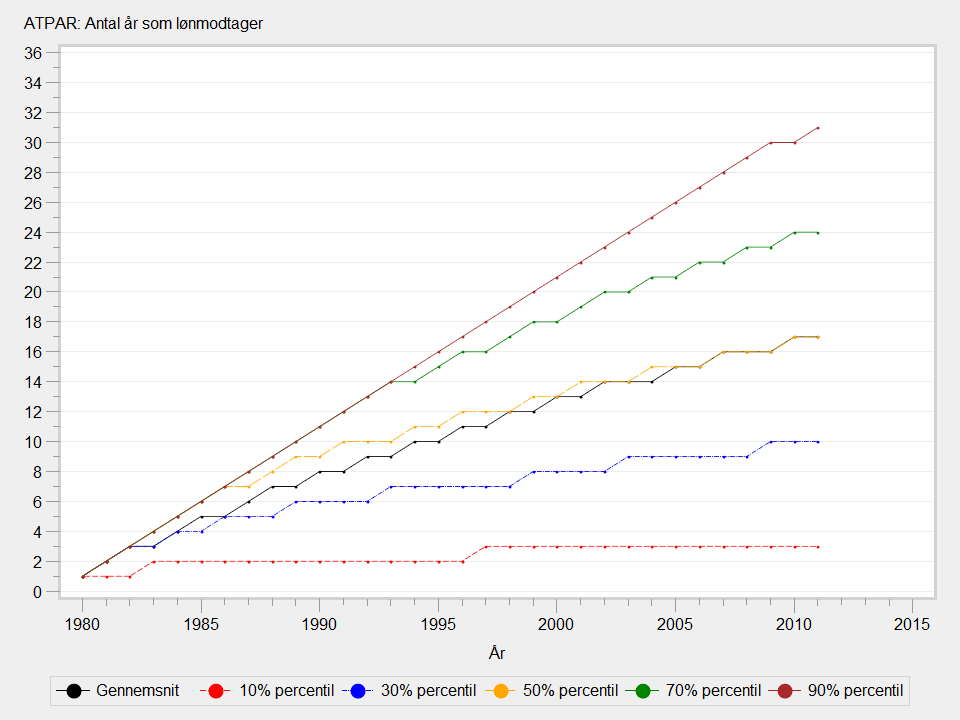 Variablen angiver antal år, som den enkelte person har været lønmodtager. Optællingen af antal år er baseret på registreringen af, hvorvidt en ATP-indbetaling forekommer for den enkelte person. Forekommer der en indbetaling i det aktuelle år, tillægges denne optællingen fra året før, såfremt en sådan forekommer. Det betyder, at hvis oplysninger om den enkelte person forekommer året før, sker der en optælling (atpar=atpar+atparxx).