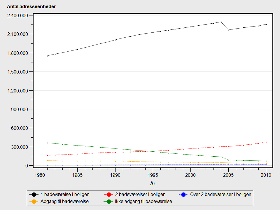 Badeforhold for bolig-/erhvervsenhed.Se bilaget "Databrud i boligopgørelsen som følge af ændringer i boligdefinition og teknisk opgørelsesmetode" under den generelle beskrivelse af statistikområdet ejendomme og boliger.