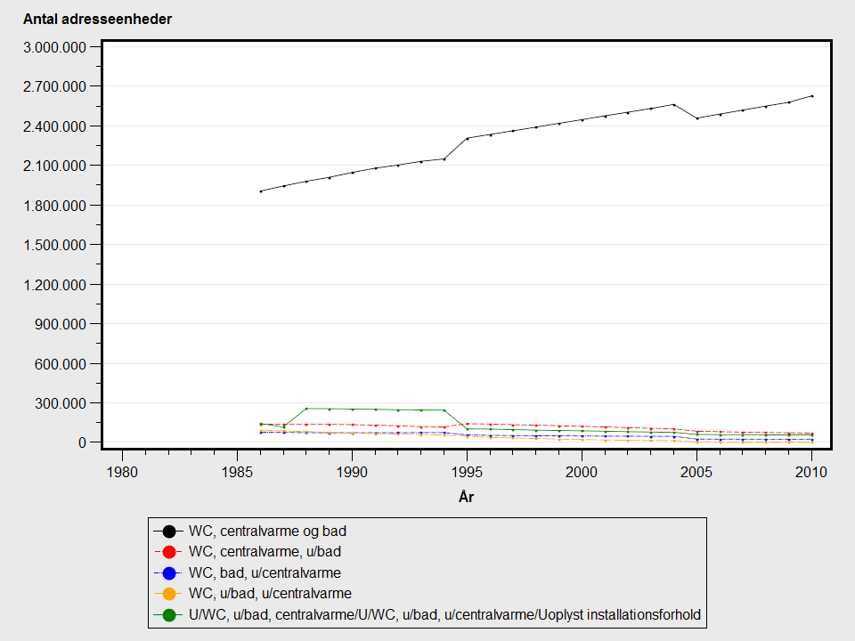 Der er databrud fra 1994 til 1995 pga. ændring i Bygningsoplysning.varmeinstallation/BBR.F229.; elradiatorer regnes fra da af som centralvarme.