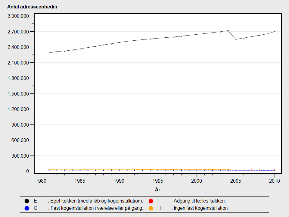 Køkkenforhold for bolig-/erhvervsenhedSe bilaget "Databrud i boligopgørelsen som følge af ændringer i boligdefinition og teknisk opgørelsesmetode" under den generelle beskrivelse af statistikområdet ejendomme og boliger.