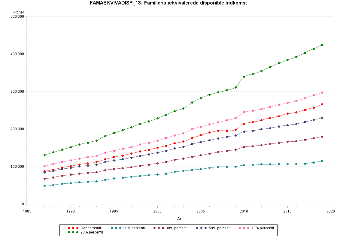 Variablen bør anvendes i det omfang, man ønsker at sammenligne disponibel indkomst for forskellige familietyper, idet Danmarks Statistik med variablen forsøger at korrigere for de stordriftsfordele, der er ved at bo flere sammenFAMAEKVIVADISP_13 er baseret på FAMDISPONIBEL_13 .