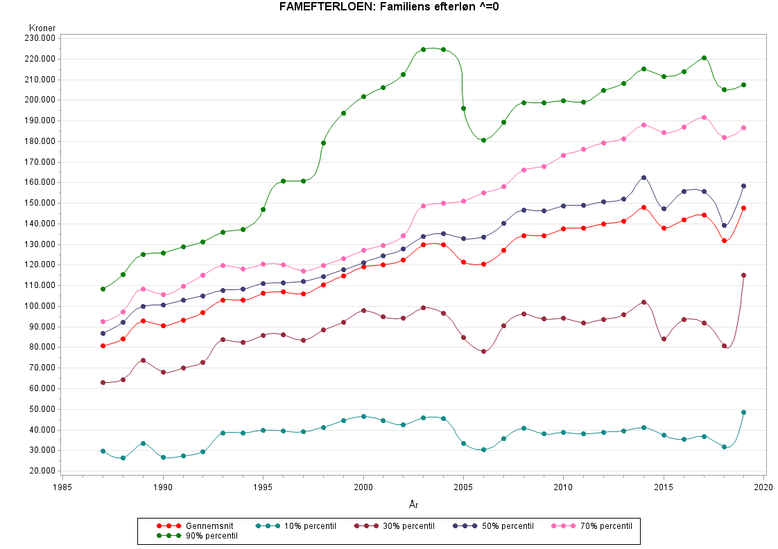 Populationen i datasæt, som udleveres af Forskningsservice, omfatter alle familier, som var bosiddende i Danmark pr. 31. december i indkomståret. I publikationer og statistikbanktabeller inkluderes kun familier, hvor mindst én voksen har været bosiddende i Danmark både primo og ultimo året (fuldt skattepligtige), og som ved årets udgang er mindst 15 år. For at genskabe denne population skal det betinges, at FAMANTALFSKATTEPLIGTIGE > 0. I vedhæftede tabel og graf er populationen den samme som den, Danmarks Statistik publicerer på, hvor FAMANTALFSKATTEPLIGTIGE > 0. Det er yderligere betinget, at beløbet er forskellig fra 0 i den vedhæftede figur og tabel.