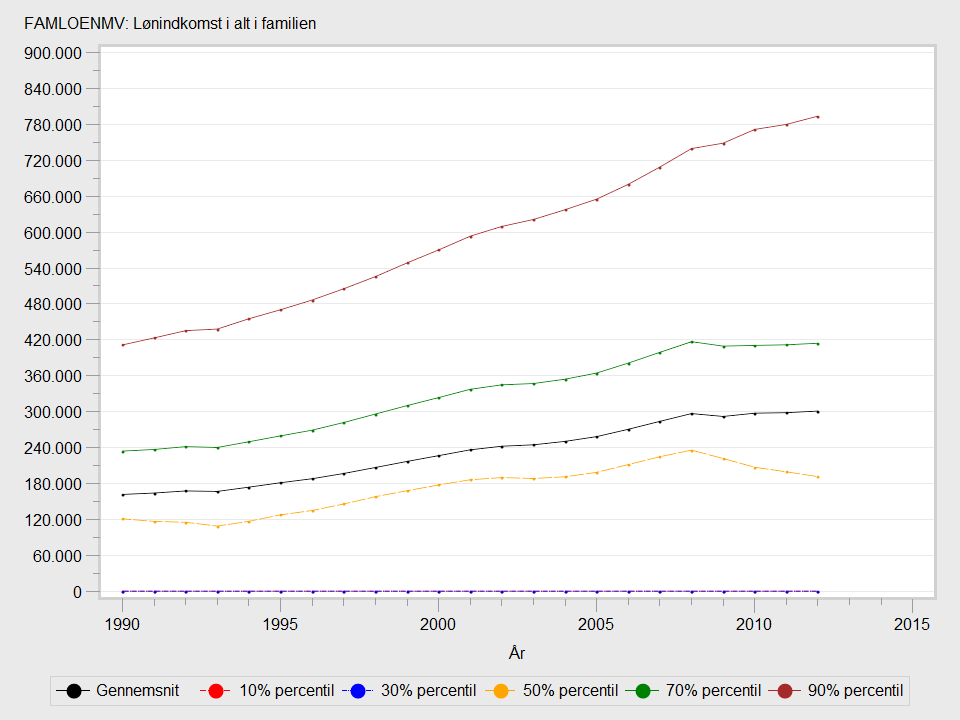 Populationen i datasæt, som udleveres af Forskningsservice, omfatter alle familier, som var bosiddende i Danmark 31. december i indkomståret. I publikationer og statistikbanktabeller inkluderes kun familier, hvor mindst én voksen har været bosiddende i Danmark både primo og ultimo året (fuldt skattepligtige), og som ved årets udgang er mindst 15 år. For at genskabe denne population skal det betinges, at FAMANTALFSKATTEPLIGTIGE > 0. I vedhæftede tabel og graf er populationen den samme som den, Danmarks Statistik publicerer på, hvor FAMANTALFSKATTEPLIGTIGE > 0.