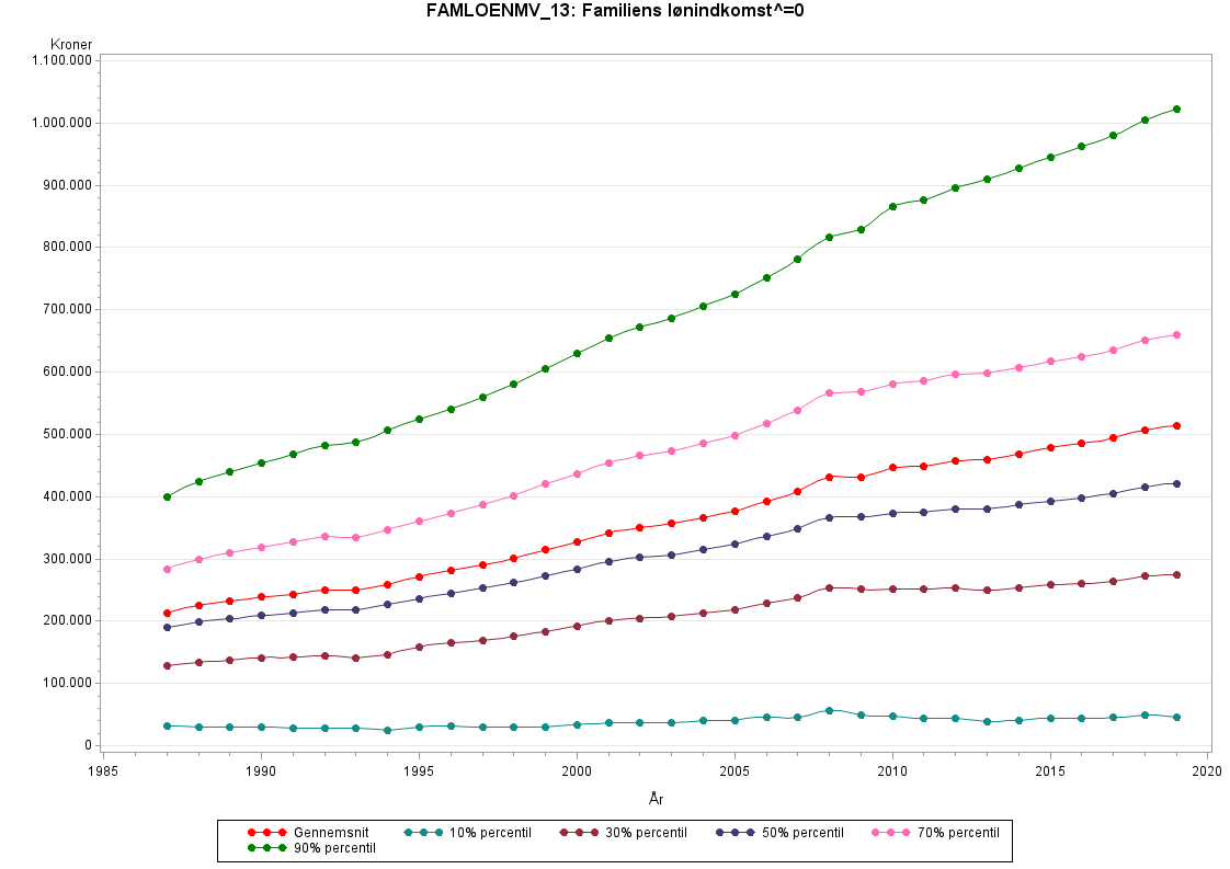 Populationen i datasæt, som udleveres af Forskningsservice, omfatter alle familier, som var bosiddende i Danmark pr. 31. december i indkomståret. I publikationer og statistikbanktabeller inkluderes kun familier, hvor mindst én voksen har været bosiddende i Danmark både primo og ultimo året (fuldt skattepligtige), og som ved årets udgang er mindst 15 år. For at genskabe denne population skal det betinges, at FAMANTALFSKATTEPLIGTIGE > 0. I vedhæftede tabel og graf er populationen den samme som den, Danmarks Statistik publicerer på, hvor FAMANTALFSKATTEPLIGTIGE > 0. Det er yderligere betinget, at beløbet er forskellig fra 0 i den vedhæftede figur og tabel.