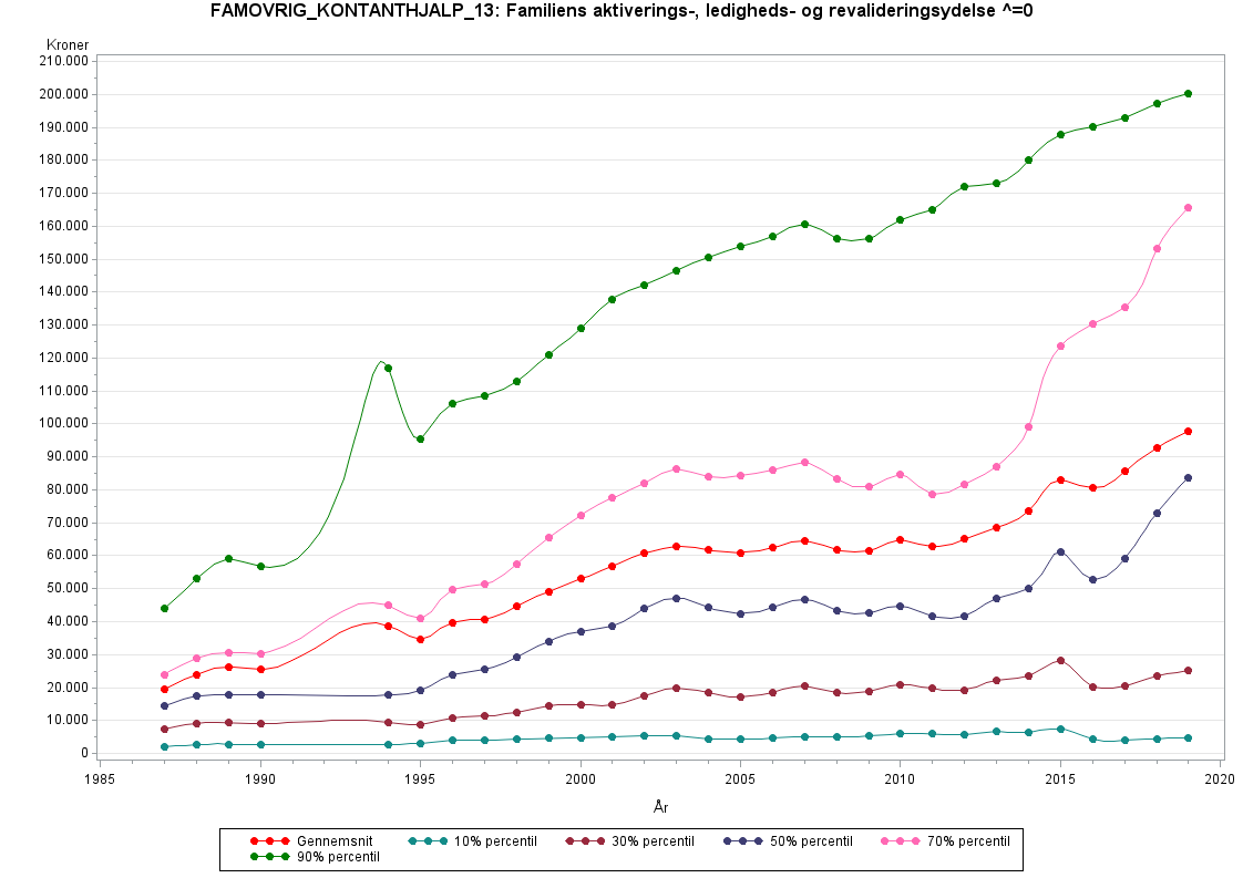 Populationen i datasæt, som udleveres af Forskningsservice, omfatter alle familier, som var bosiddende i Danmark pr. 31. december i indkomståret. I publikationer og statistikbanktabeller inkluderes kun familier, hvor mindst én voksen har været bosiddende i Danmark både primo og ultimo året (fuldt skattepligtige), og som ved årets udgang er mindst 15 år. For at genskabe denne population skal det betinges, at FAMANTALFSKATTEPLIGTIGE > 0. I vedhæftede tabel og graf er populationen den samme som den, Danmarks Statistik publicerer på, hvor FAMANTALFSKATTEPLIGTIGE > 0. Det er yderligere betinget, at beløbet er forskellig fra 0 i den vedhæftede figur og tabel.