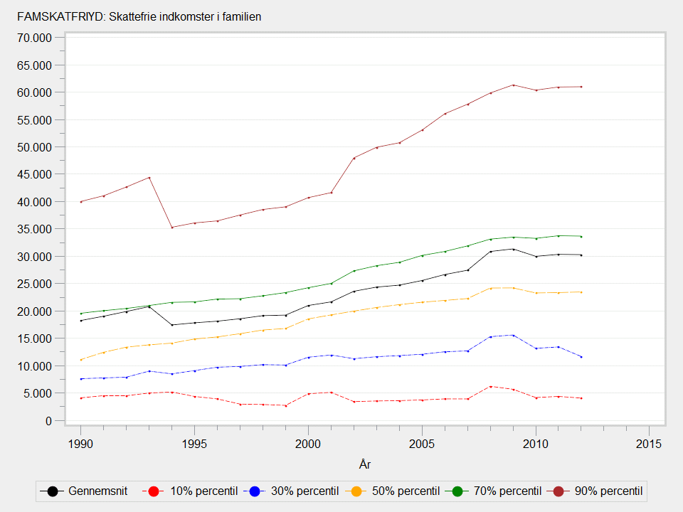 Populationen i datasæt, som udleveres af Forskningsservice, omfatter alle familier, som var bosiddende i Danmark pr. 31. december i indkomståret. I publikationer og statistikbanktabeller inkluderes kun familier, hvor mindst én voksen har været bosiddende i Danmark både primo og ultimo året (fuldt skattepligtige), og som ved årets udgang er mindst 15 år. For at genskabe denne population skal det betinges, at FAMANTALFSKATTEPLIGTIGE > 0. I vedhæftede tabel og graf er populationen den samme som den, Danmarks Statistik publicerer på, hvor FAMANTALFSKATTEPLIGTIGE > 0. Det er yderligere betinget, at beløbet er forskellig fra 0 i den vedhæftede figur og tabel.