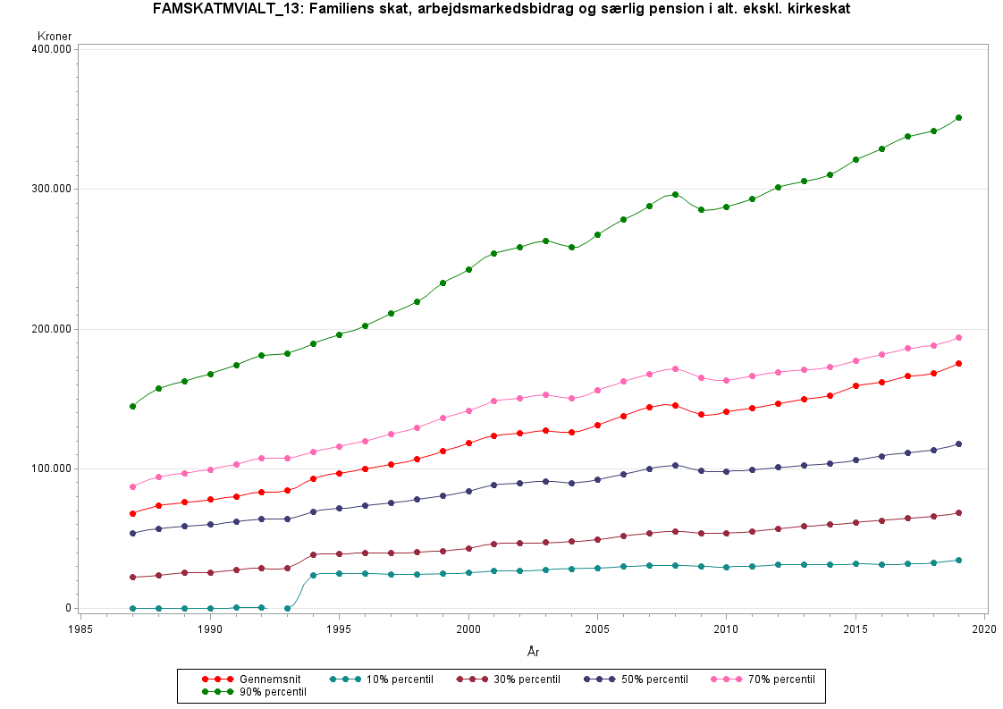 Populationen i datasæt, som udleveres af Forskningsservice, omfatter alle familier, som var bosiddende i Danmark 31. december i indkomståret. I publikationer og statistikbanktabeller inkluderes kun familier, hvor mindst én voksen har været bosiddende i Danmark både primo og ultimo året (fuldt skattepligtige), og som ved årets udgang er mindst 15 år. For at genskabe denne population skal det betinges, at FAMANTALFSKATTEPLIGTIGE > 0. I vedhæftede tabel og graf er populationen den samme som den, Danmarks Statistik publicerer på, hvor FAMANTALFSKATTEPLIGTIGE > 0.