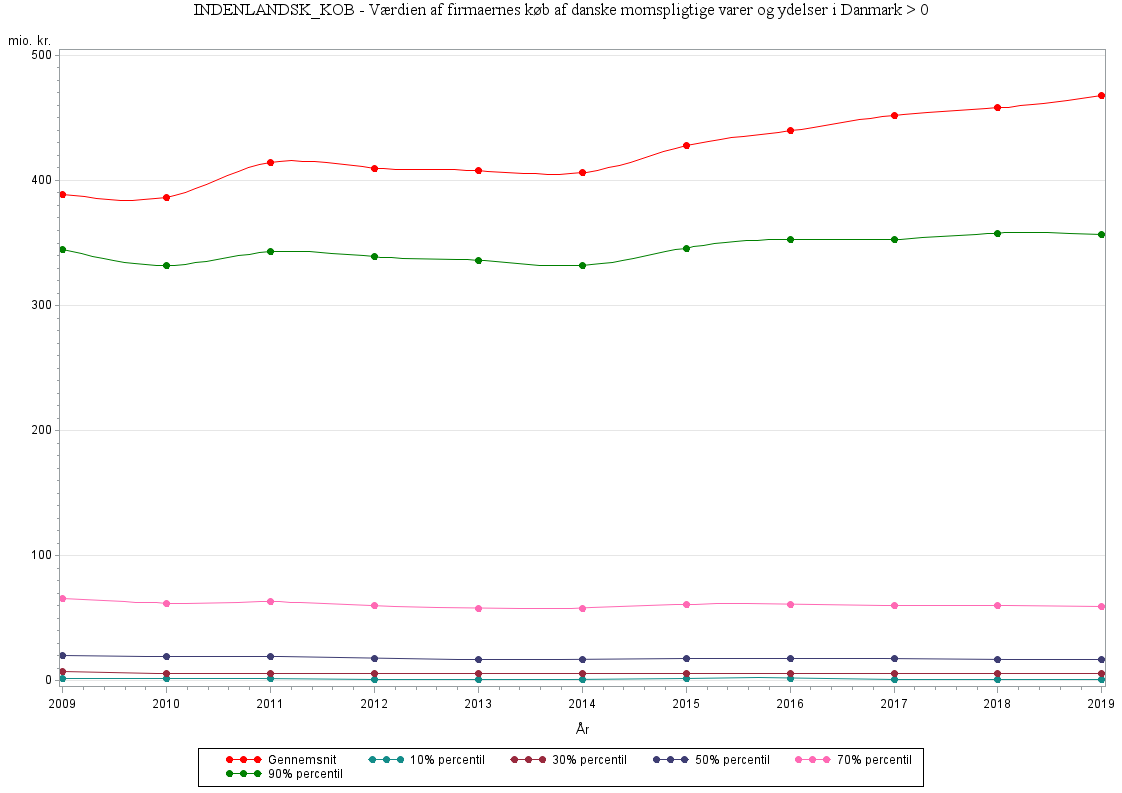 Indenlandsk_køb=købsmoms*(100/25)-((Import_moms_varer+Import_moms_ydelser)*(100/25)), hvor købsmoms er momsangivelsens felt "Købsmoms", og Import_moms_varer er "Moms af varekøb i udlandet (både EU og tredjelande)", og Import_moms_ydelser er "Moms af ydelseskøb i udlandet med omvendt betalingspligt". Beløbet Indenlandsk_køb er eksklusive moms. Beløbet omfatter momsregistrerede virksomheders momspligtige indenlandske køb. Beløbene for de enkelte brancher offentliggøres i mio. kr. i Statistikbanken, men er lagret i 1.000 kr. i databasen.Detaljeret beskrivelse
