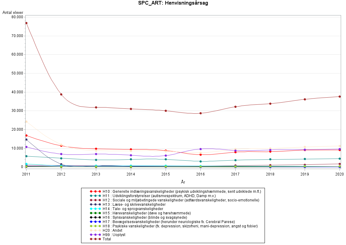 Grundskoleregisteret bliver opgjort pr. 1. oktober i det gældende år. Fx bliver skoleåret 2020/21 opgjort for 1. oktober 2020. Populationen indeholder herved alle de grundskoleelever, der er tilknyttet en skole pr. 1. oktober i det gældende år. Bemærk, at alle tabeller og grafer er dannet alene på basis af de elever der modtager en eller anden form for specialundervisningstiltag. Det vil sige, at alle elever med SPC_ART= H00 (Ikke specialundervisningselever) er ekskludret i grafer og tabeller, idet graferne rent visuelt ikke ville kunne vise udviklingen over tid i de forskellige specialundervisningstiltag.