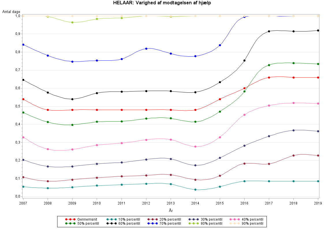 Da en person kan have modtaget flere typer af ydelser i løbet af året, er denne andel ikke kun beregnet for de enkelte ydelser, men også for nogle almindeligt brugte aggregeringer: KONTANTHJÆLP, REVALIDERING, AKTIVEREDE, INTRODUKTIONSYDELSE, LEDIGHEDSYDELSE og FORSØRGELSESYDELSE I ALT.