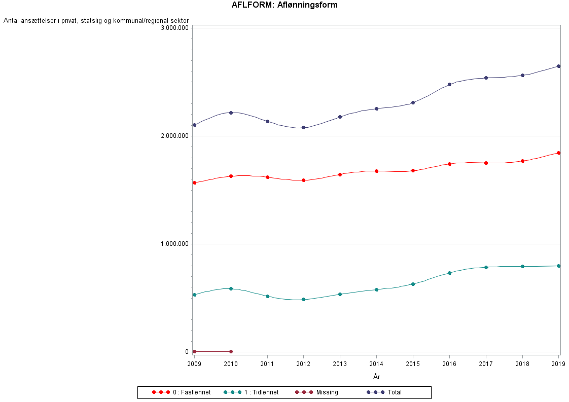 Aflønningsform angiver om lønmodtageren er time- eller fastlønnet.AFLFORM=0 (Fastlønnede)