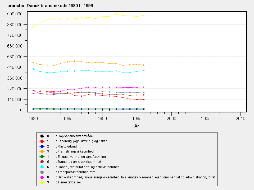 Variablen BRANCHE er dannet for perioden 1980 til 1996.Den femcifrede branche nomenklatur afløses i 1993 af den 6-cifrede NACE - den fælles EU-branchenomenklatur.