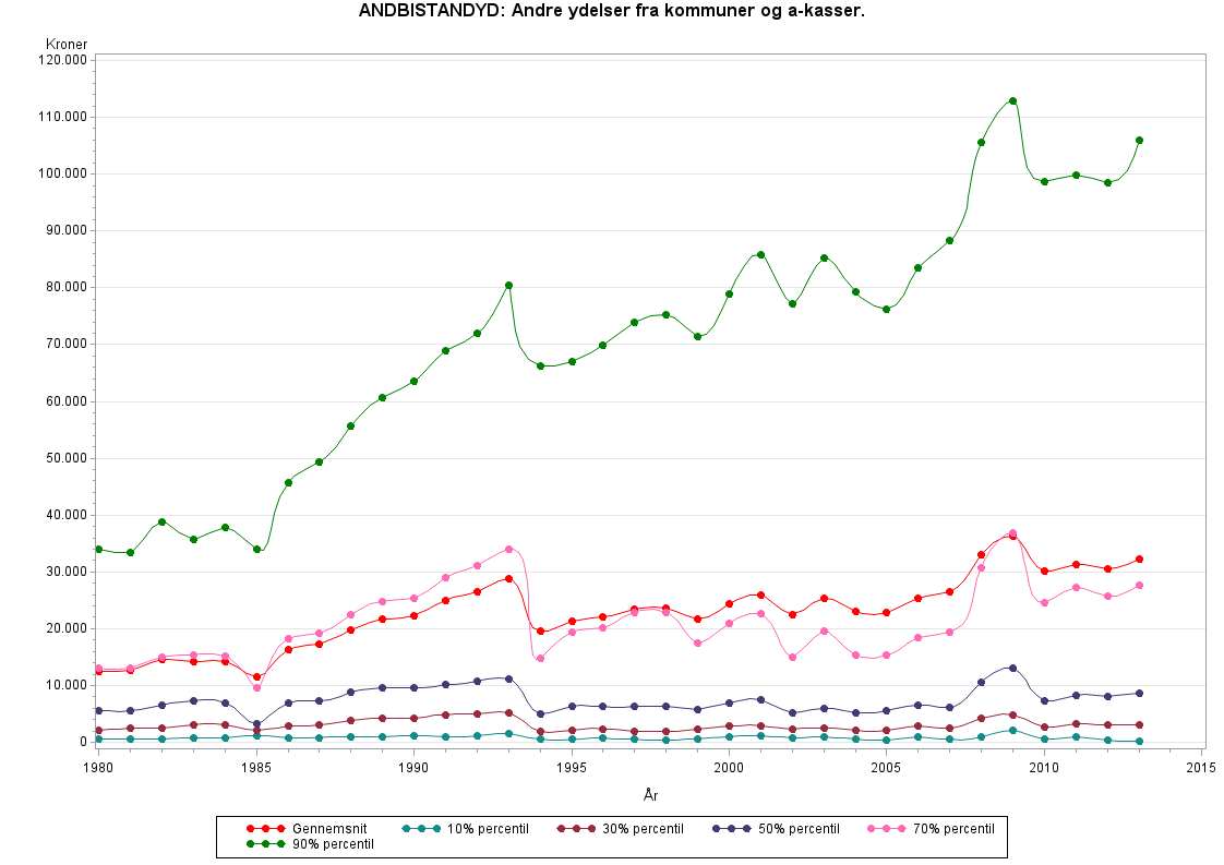 Fra 1994 inkluderes endvidere arbejdsgiverbetalte sygedagpenge. De ligger før 1994 i variablen RESUINK_GL. Det giver en kraftig stigning i antal personer med ANDBISTANDYD og et fald i gennemsnitsbeløbet.