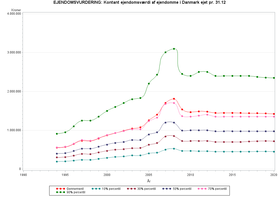Variablen har skiftet navn fra "KOEJD_NY05" til "EJENDOMSVURDERING" indhold uændret.Kontant ejendomsværdi af ejendomme i Danmark inkl. erhvervsejendomme og ubebyggede ejendomme (fra 1994). ( offentlige vurdering)