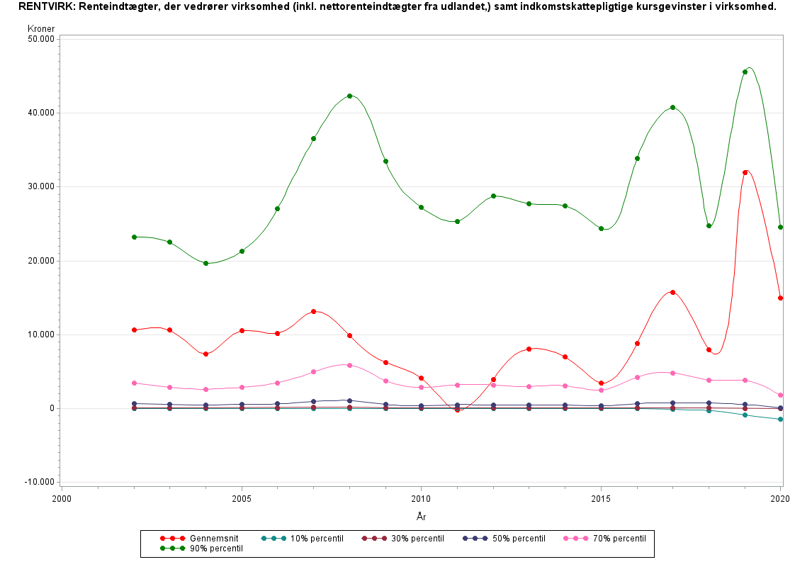 Renteindtægter, der vedrører virksomhed (inkl. nettorenteindtægter fra udlandet,) samt indkomstskattepligtige kursgevinster i virksomhed.Variablen eksisterer fra 2002