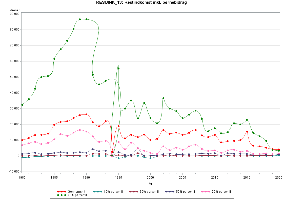 Sammenhæng med andre variable. RESUINK_13 =ASKPLI+QANDEN+UNHINDK+HAEDGAVS+ANPERIND+SFRIFOND+QUDINK+Skattefri soldaterlegater+ tilbagebetalt efterløns- og fleksydelsesbidrag Hvor: ASKPLI, er anden arbejdsmarkedsbidragsfri a-skattepligtig indkomst(residual) QANDEN, er honorarer hvoraf der ikke skal betales arbejdsmarkedsbidrag og foreløbig skat (A-skat) men er skattepligtigt UNHINDK, er modtaget underholdsbidrag og børnebidrag HAEDGAVS, er hædersgaver m.v. hvoraf arbejdsmarkedsbidrag ikke skal betales, og hvor der ikke er indeholdt foreløbig skat ANPERIND, er anden personlig indkomst (personlig indkomst er ekskl. kapitalindkomster). I ANDPERIND indgår fx også indkomst fra salg af kryptovaluta, som skal selvangives af den skattepligtige borger. SFRIFOND, er skattefri uddelinger fra fonde og foreninger mv. QUDINK, er anden personlig indkomst fra udlandet end løn (personlig indkomst er ekskl. kapitalindkomster) Sammenhæng med variable før 2013 revisionen. RESUINK_13 = RESUINK(1994-)+RESUINK_GL(1980-1993) + tilbagebetalt efterløns-og fleksydelsesbidrag Ændringer over tid. Før 1983 ligger ydelser fra Statens Uddannelsesstøtte(SU) i RESUINK_13 ( fra 1983 ligger disse ydelser i variablen STIP, som er en del af de offentlige overførsler-OFF_OVERFORSEL_13) I 1986 ligger en del arbejdsløshedsdagpengene i variablen RESUINK_13 (hvor de normalt ligger i variablen ARBLHUMV). Fra 1988 er den del af børnebidraget, som udgøres af normalbidraget, skattefrit for børn under 18 år (i 2006 udgør normalbidraget 12.456 kr.). Se diverse årgange af publikationen "Skatten". Fra 1991 flyttes tjenestemandspension og privatpension fra RESUINK_13 til selvstændige variable QTJPENS og QPRIPENS. Fra 1993 flyttes værdi af gruppelivsforsikring fra RESUINK_13 til LOENMV_13. Fra 1994 indgår arbejdsmarkedsbidragspligtige honorarer ikke i RESUINK_13 (ligger i erhvervsindkomst fra 1994) I 1994 ligger RESUINK_13 mellem 0 og -2 for mange personer(afrundingsfejl) Fra 2002 indgår beregnet skattefri del af børnebidrag hos barnet. I 2002 er denne størrelse på 1,9 mia. kr. Størstedelen heraf er til børn under 15 år, som ikke indgår i vedlagte figur og tabel. Fra 2006 inkluderes bidrag, hvor bidragsyderen ikke har betalt (kommune har betalt beløbet). I 2002 er der foretaget en ændring i opgørelsen af især overførselsindkomsterne. Der er to hovedkilder til indkomsterne-Skats Slutligningsregister og Skats Oplysningsseddelregister) jf. vedlagte dokument "dannelse af indkomstregister og databrud 2001-2002.doc". For årene før 2002 ligger forskellen på de to kilder (positiv/negativ) som en del af RESUINK_GL. Fra og med 2002 er de negative bidrag fjernet ved hjælp af korrektioner i overførselsindkomsterne, jf. ovenfor omtalte bilag. I 2006 inkluderes børnebidrag, hvor kommunerne har lagt beløbet ud for den bidragspligtige. 2008 til 2010 inkl. løn fra ikke skattepligtige personer uden personnummer ( ligger fra 2011 i variablen LOENMV_13) Fra 2010 inkl. skattefri legater til soldater. Fra 2011 inkl. honorarer til ikke skattepligtige personer uden personnummer Fra 2012 er en række indkomster fra udlandet flyttet fra RESUINK_13 til LOENMV_13 (for 2012 13.713 personer med i alt 4,4 mia. kr.). For 2013 er beløb fra Skats E-indkomstregister ikke reguleret ned til maksimalt sumbeløb fra Slutligningen. Derfor er der ca. 50.000 personer med negativ RESUINK_13, Heraf er halvdelen ikke skattepligtige personer. I 2006 er børnebidraget på 3,0 mia. kr. Heraf kommer de 0,8 mia. kr. fra kommunerne (bidragsyderen har ikke betalt). I 1998 er der mange personer med et lille beløb i RESUINK_13. Det skyldes udbetalinger af godtgørelser fra fagforeningerne i forbindelse med storstrejken dette år.