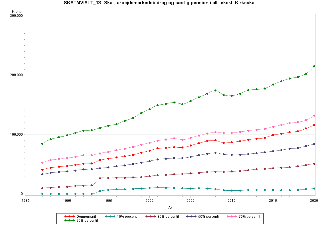 Populationen, som udleveres af Forskningsservice, består af personer som er i befolkningen pr. 31. 12 i indkomståret, samt alle der er registreret i Skats Slutligningsregister med en indkomst eller formue (inkl. udvandrede og døde i løbet af året). Fra 2004 indgår også ikke-skattepligtige personer, se nærmere i bilaget "Population i personindkomsterne" under beskrivelse af personindkomst (http://www.dst.dk/da/TilSalg/Forskningsservice/Dokumentation/hoejkvalitetsvariable/personindkomster). I vedhæftede graf og tabel er populationen afgrænset til de personer, der findes i Statistikbanken og i publikationer. Det svarer til alle personer, som er fuldt skattepligtige hele året, har bopæl i Danmark både primo og ultimo året og er mindst 15 år ved årets udgang. Denne population findes ved at sætte variablen OMFANG=1 og alderen ultimo året større end 14.