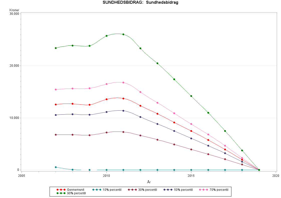 Skat/bidrag på otte pct. af den skattepligtige indkomst nedsat med skatteværdi af personfradrag og evt. nedslag for udenlandsk indkomst.Sundhedsbidraget var 8 % i perioden 2007-2011 og faldt fra og med 2012 med 1 procentpoint om året. Bidraget var således 1 % i 2018, og fra og med 2019 eksisterer bidraget ikke længere i det danske skattesystem.[1] Bundskatten steg i samme periode med 1 procentpoint årligt