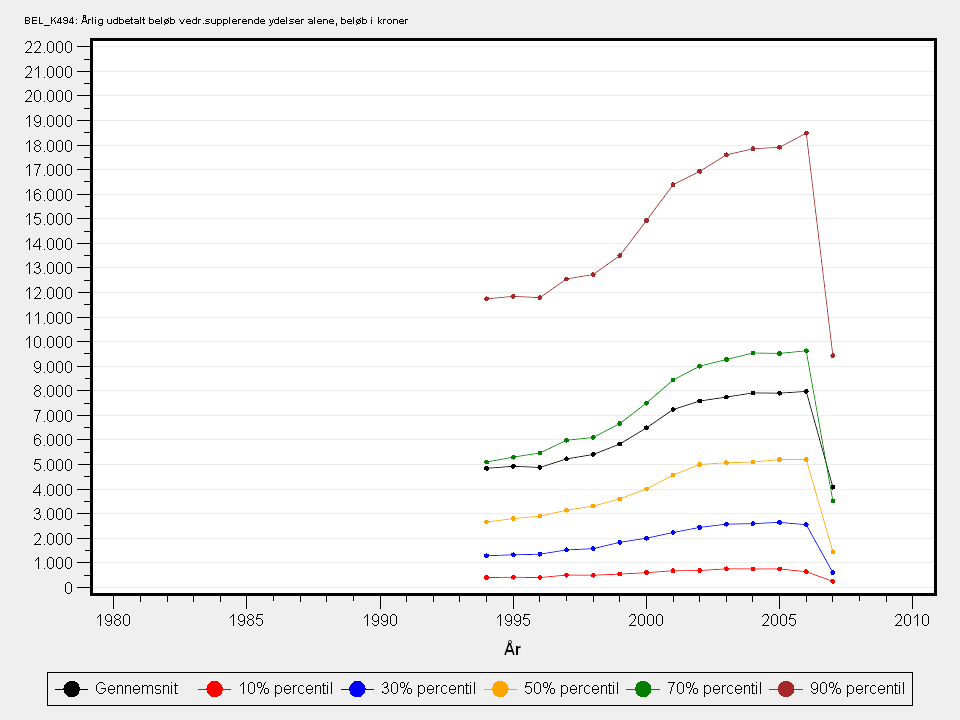Der er et kraftigt fald i ydelserne fra 2006 til 2007, men det har ikke været muligt at finde årsagen (kan være såvel lovgivningsmæssige forhold som databehandlingsproblemer mv.)