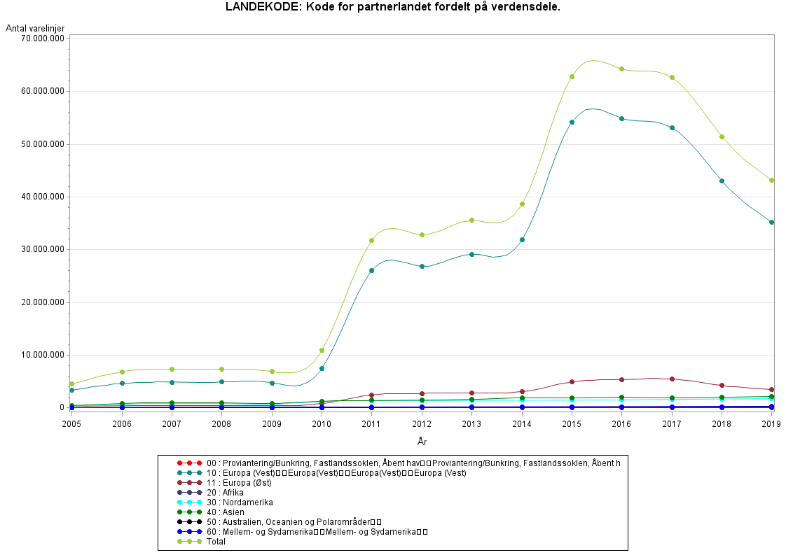 I Extrastat import indsamles både oprindelsesland og afsendelsesland, men optælles normalt på oprindelsesland.