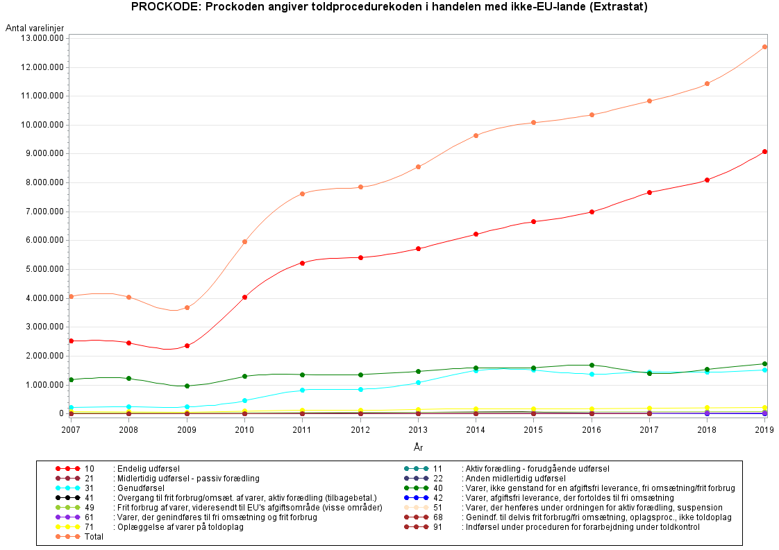 I figur/tabel på PROCKODE for handelen med ikke-EU-lande (Extrastat) er toldprocedurekoderne (1.-2. cifre og 3.-4. cifre) summeret efter følgende: