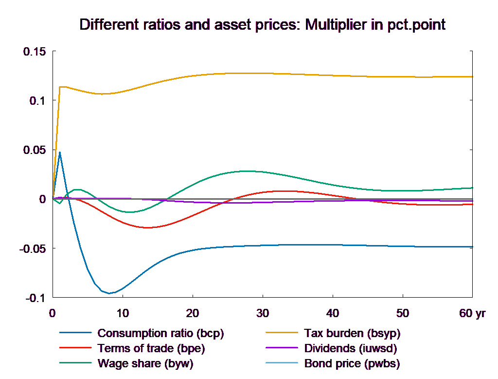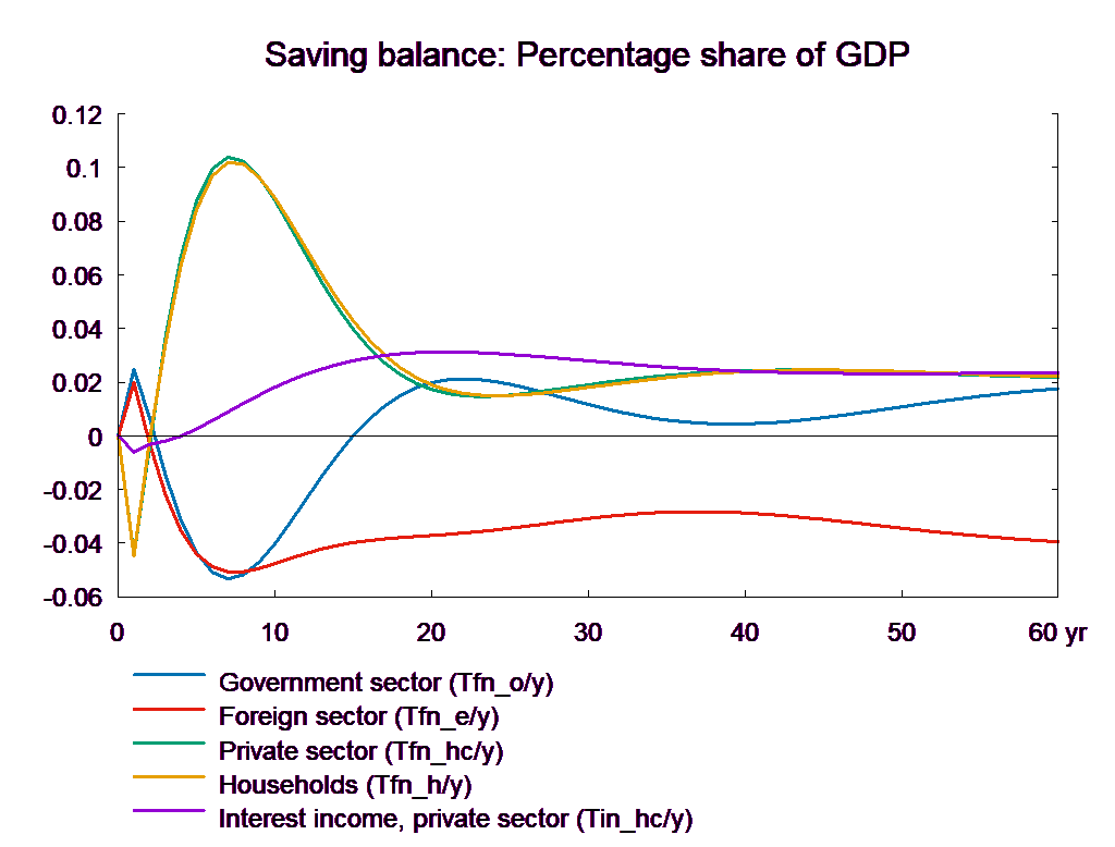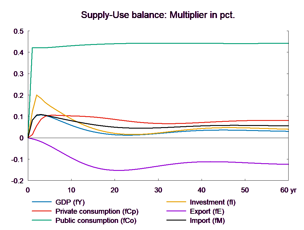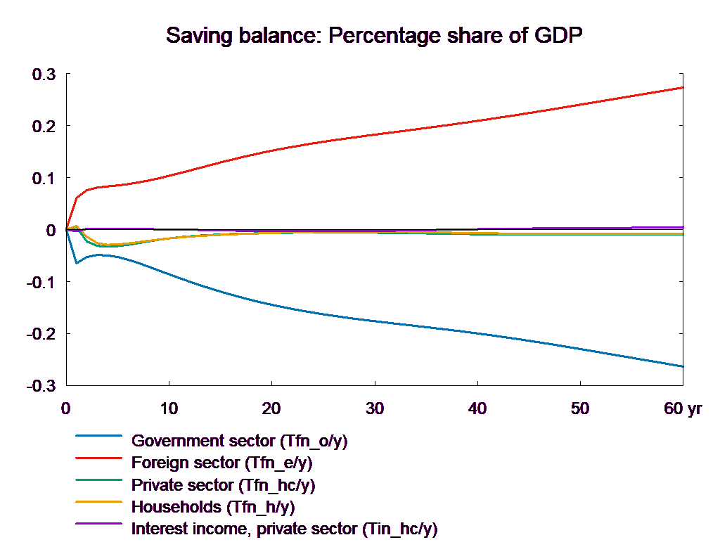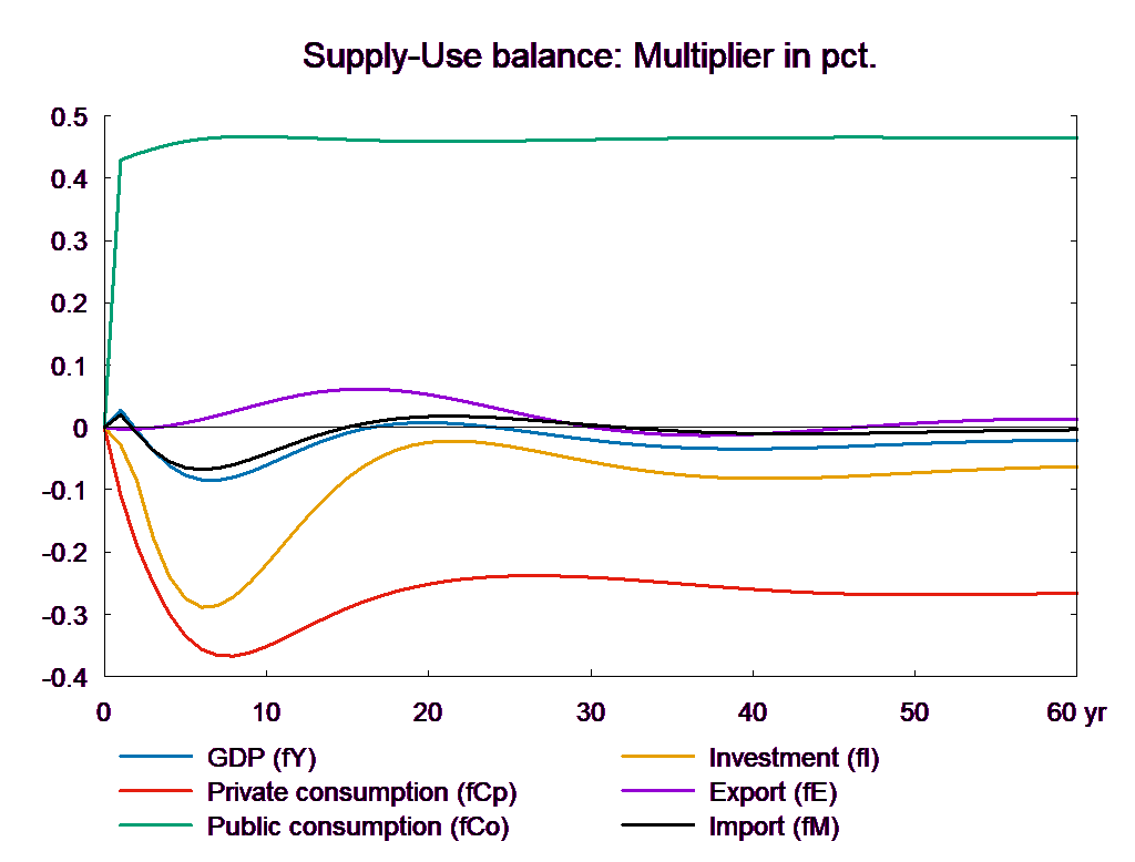 The consumption equation stabilizes and returns the saving surplus of the private sector to the baseline. However, because of the absence of fiscal reaction function, the public saving deteriorates permanently. If the higher public consumption is financed by higher taxes, there will be no effect on public budget in the long run. In the following, two scenarios are presented: in the first case the public purchase is not financed and in the second case the additional public purchase is financed by higher income taxes.