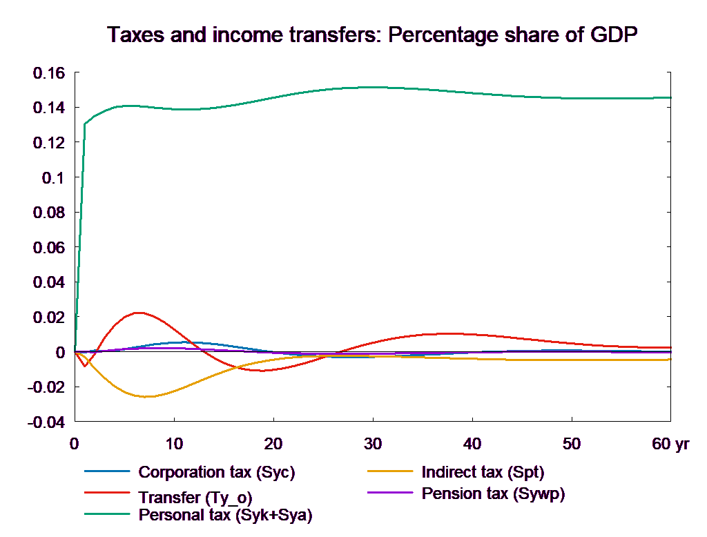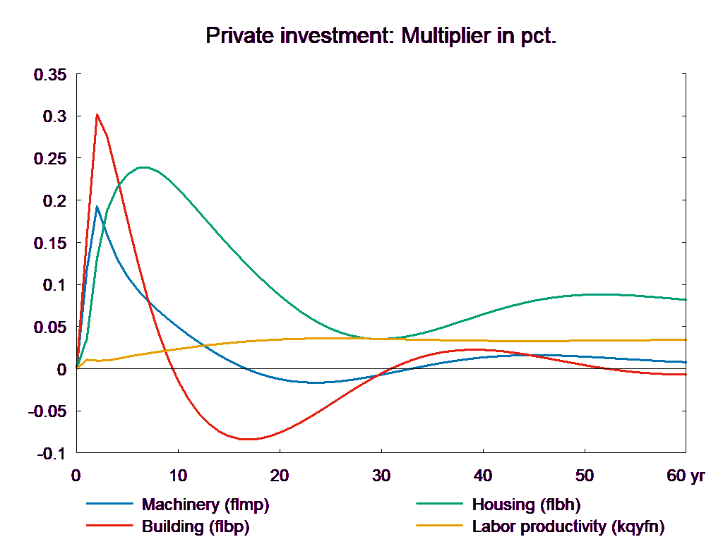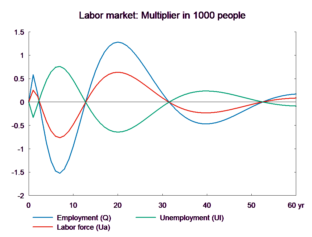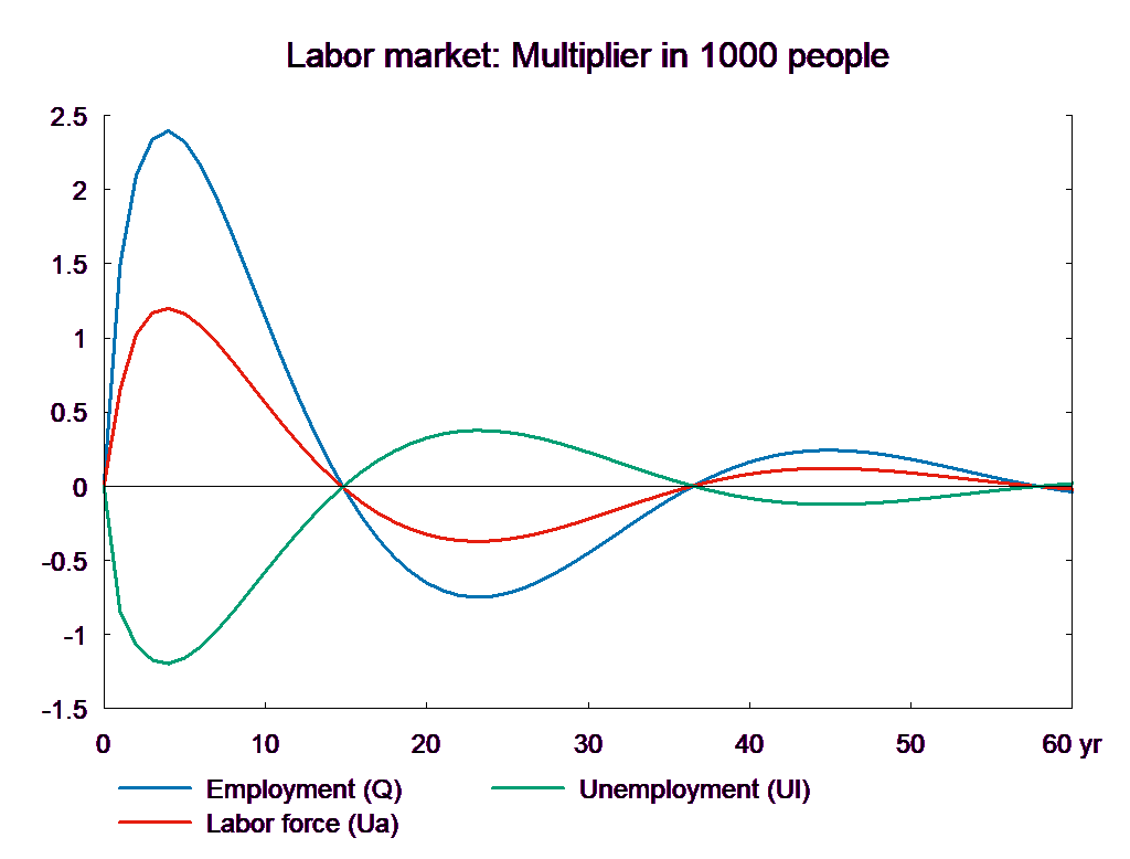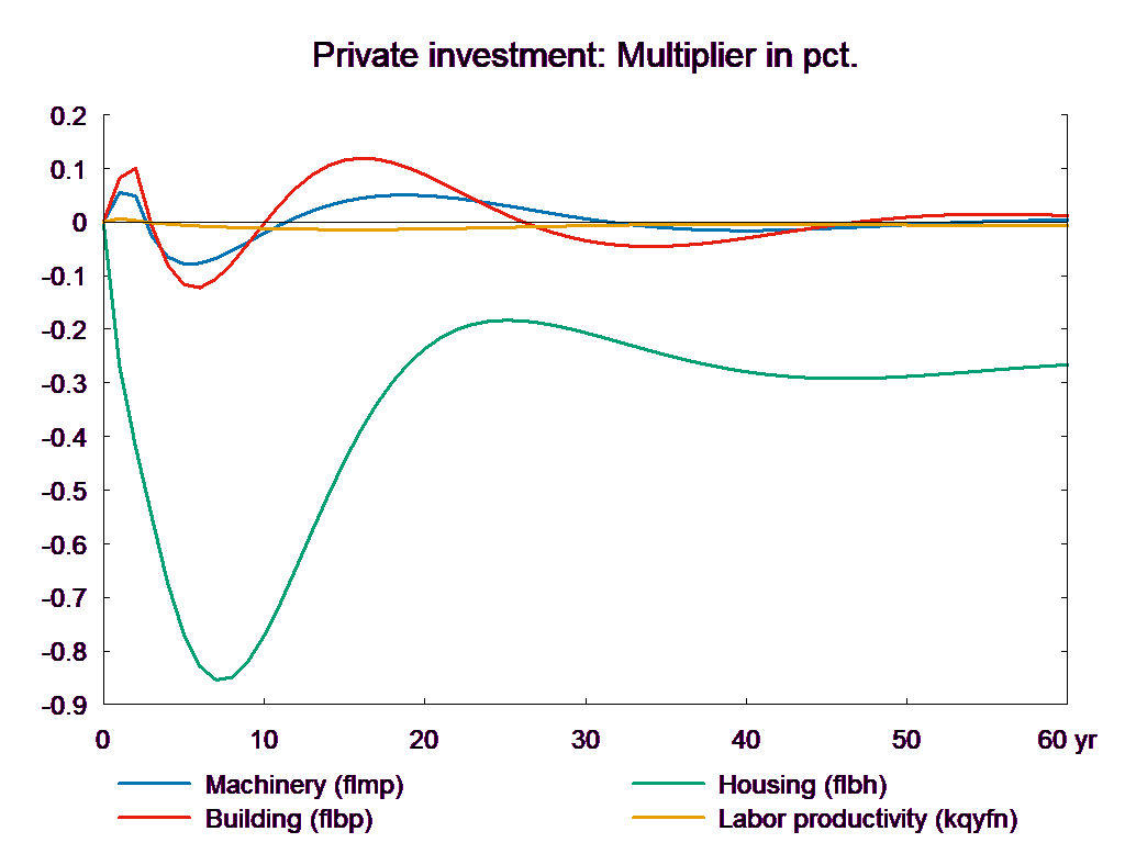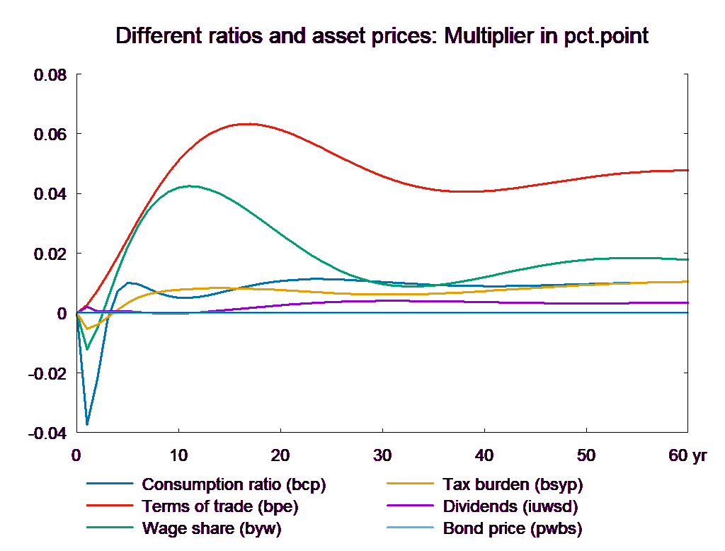 The consumption equation stabilizes and returns the saving surplus of the private sector to the baseline. However, because of the absence of fiscal reaction function, the public saving deteriorates permanently. If the higher public consumption is financed by higher taxes, there will be no effect on public budget in the long run. In the following, two scenarios are presented: in the first case the public purchase is not financed and in the second case the additional public purchase is financed by higher income taxes.