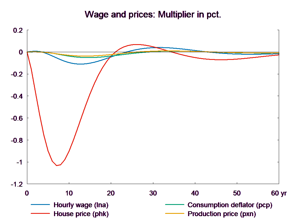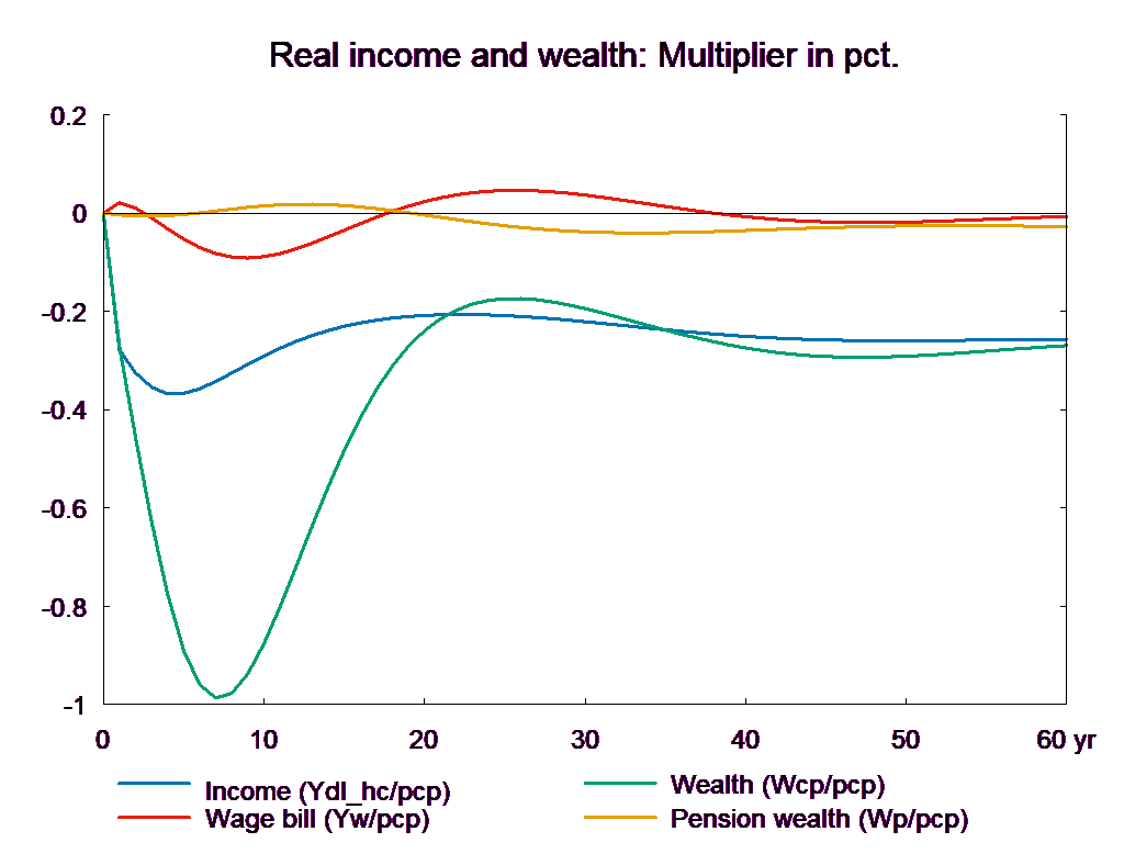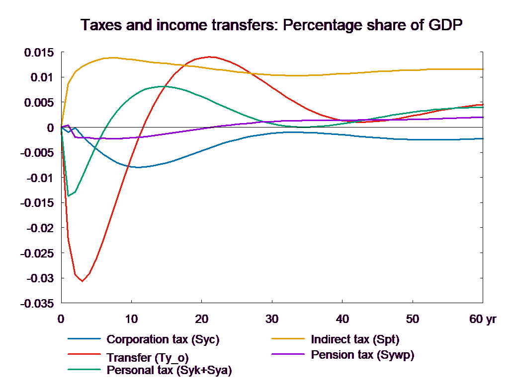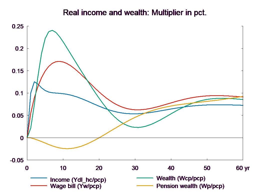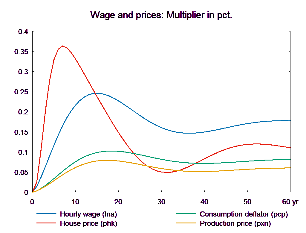 The consumption equation stabilizes and returns the saving surplus of the private sector to the baseline. However, because of the absence of fiscal reaction function, the public saving deteriorates permanently. If the higher public consumption is financed by higher taxes, there will be no effect on public budget in the long run. In the following, two scenarios are presented: in the first case the public purchase is not financed and in the second case the additional public purchase is financed by higher income taxes.