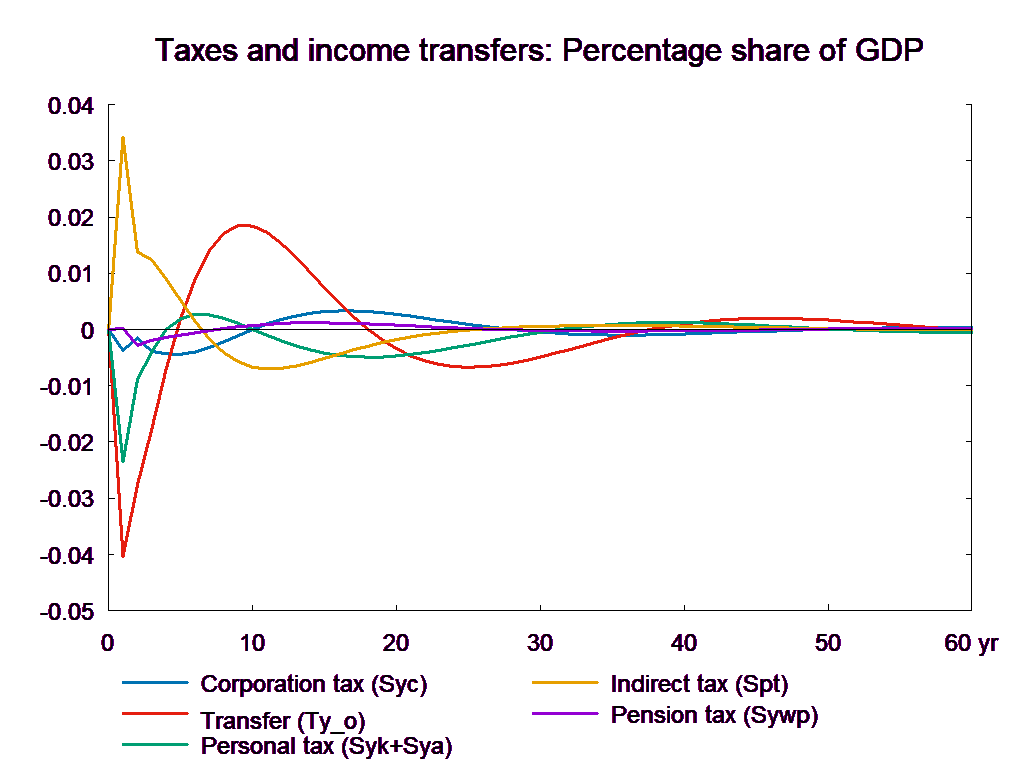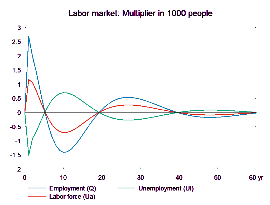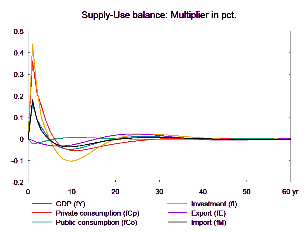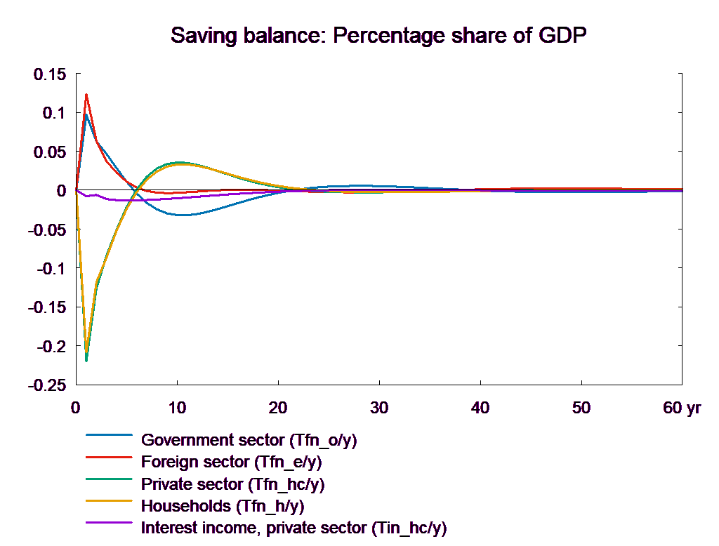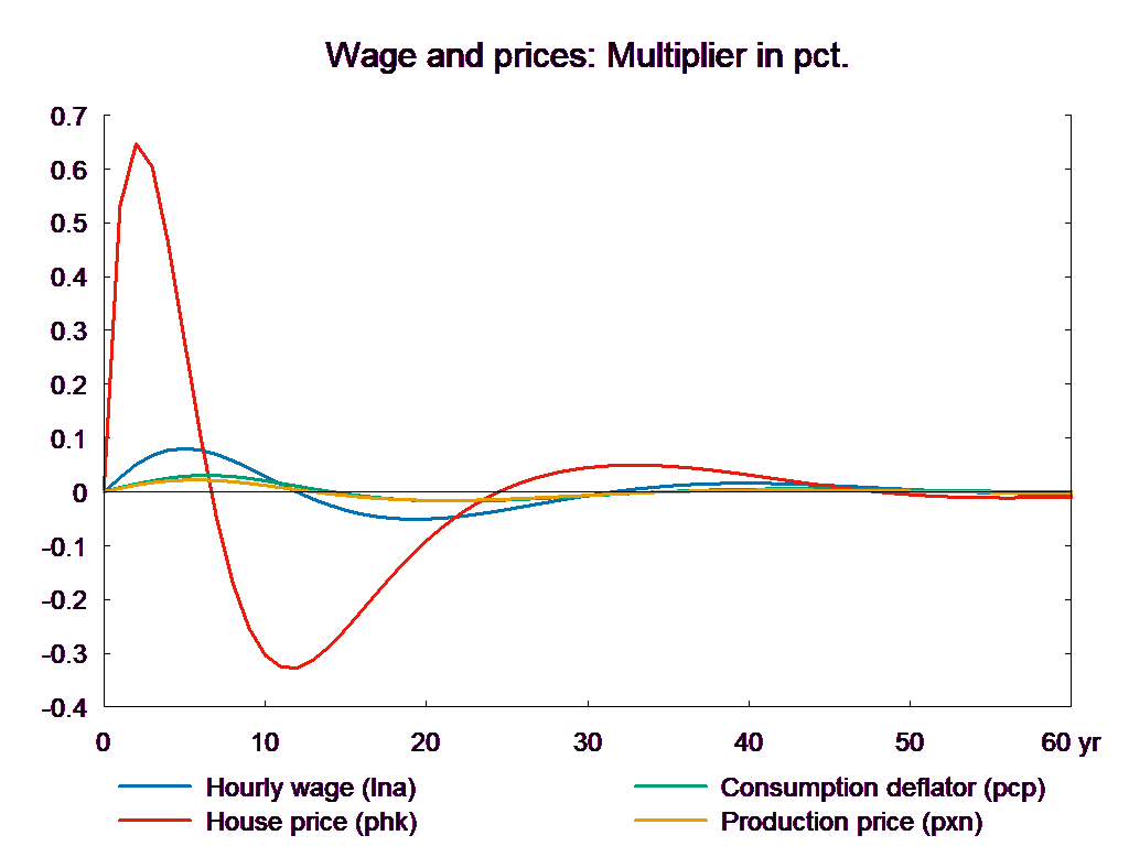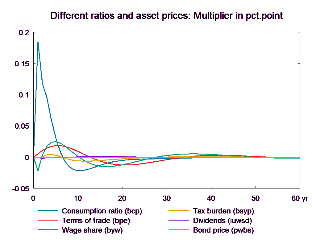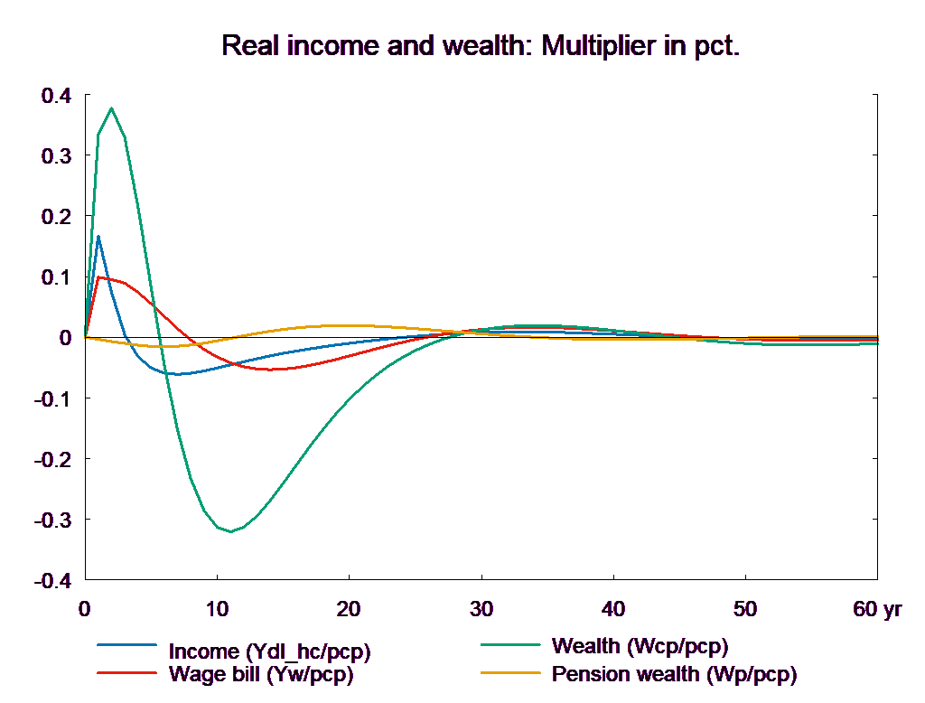 The effect on employment, production, private and public saving balances, etc is temporary reflecting that it is a temporary demand shock and the consumption function is an error correction equation that adjusts back to the long term value. Consumption keeps adjusting until the ratio between wealth and income is back to the baseline value. The adjustment of consumption, however, takes a long time. Consumption remains above the baseline for a few years followed by a long period below the baseline. The latter period restores wealth and the ratio between income and wealth will return to the equilibrium value, and consumption will return to the baseline. The initial stimulus to economic activity is sufficient to stimulate wages and hence prices, and it takes time for the higher wage rate to return to the baseline.