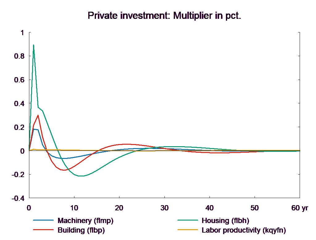The experiment also makes the housing market fluctuate. In the first year, house prices increase sharply because of the higher consumption and this raises housing wealth. Higher housing wealth in turn expands private consumption. The immediate positive impact on house prices triggers a higher Tobin’s q and housing investment increases. Later on, the higher housing capital reduces house price and Tobin's q after the initial increase in consumption has disappeared. The lower house price drives housing investment and hence housing capital down. In this way, housing capital returns to the baseline and the area between Tobin's q and the baseline converges to zero just like the area between investments and its baseline. In general, the temporary shock to consumption starts an adjustment process with fluctuations.
