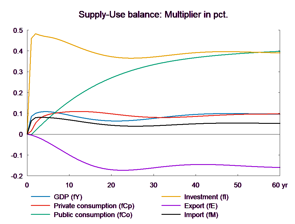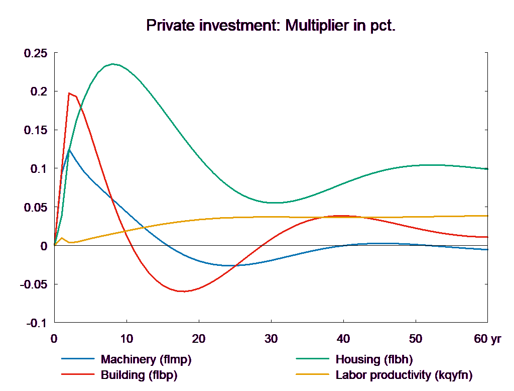 There is a small positive effect on production in the long run due to a substitution effect. A substitution effect arises when a change in the relative prices of factors induces producers to use more of a relatively cheaper factor and less of a relatively more expensive factor. In the present case, the relative price of capital falls due to the import content in investments. This leads to an increase in the capital intensity of production and hence labor productivity increases. Consequently, the same workforce can produce a higher output. In general, there are some long run effects on production due to factor substitution in most of the demand shocks, usually the substitution effects are smaller. For more about substitution and relative factor prices see the supply side experiments fromsection 9onwards.