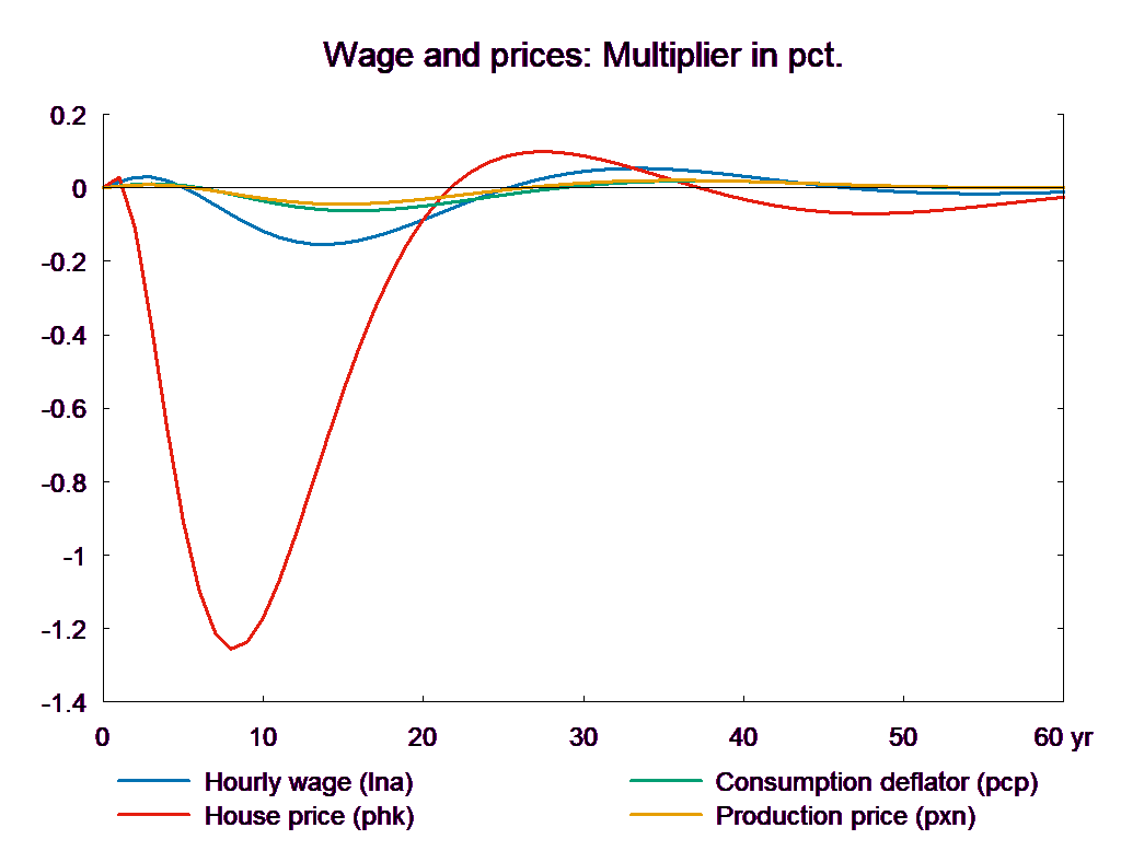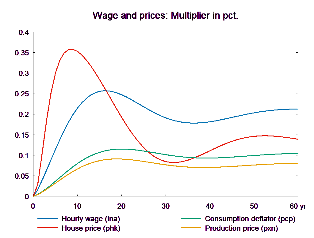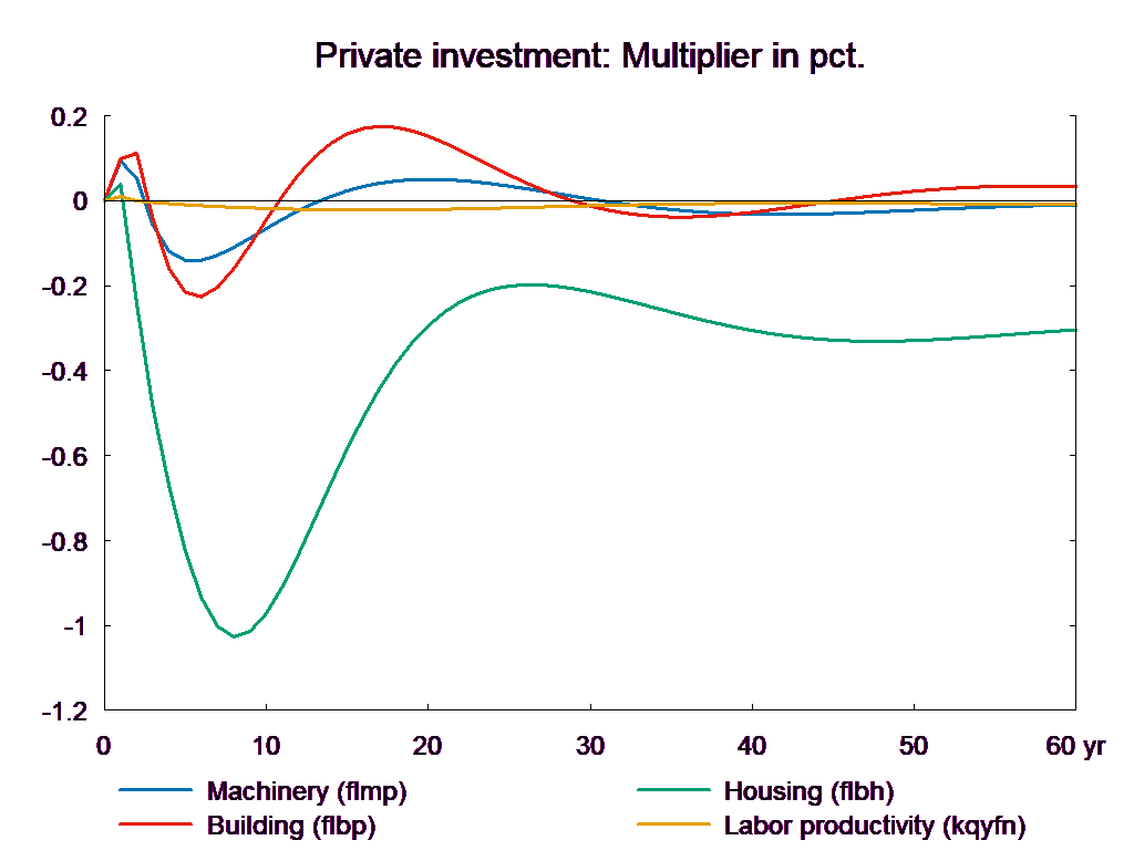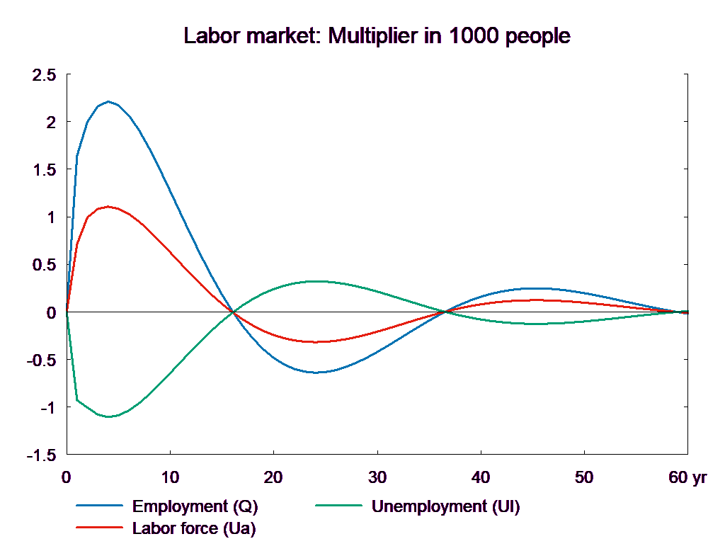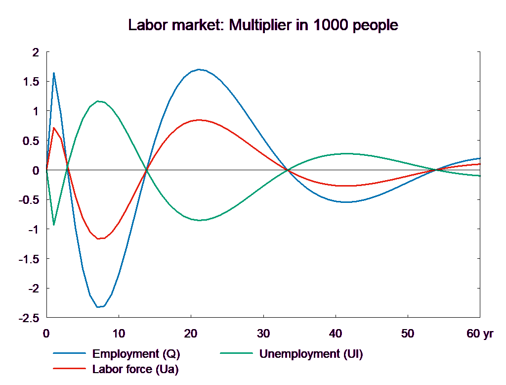 The higher public investment raises private sector production and employment in the short run. The income multiplier expands final demand more than the initial change in investments.▼ In Keynesian economic theory, the income multiplier refers to the final change in income as compared to the injection of capital deposits or investments which originally fueled the growth. It is usually used as a measurement of the effects of government spending on income. In the present experiment, the income multiplier can be seen as the ratio between the effects on final demand and the change in government investment in buildings.Compared to the government purchase of goods and services experiment, the effect on the domestic economy is larger because the import content of building investments is low. In the medium term, the higher employment increases wage growth and the wage-driven crowding out returns unemployment to its baseline in the long run.▼ The wage relation in ADAM is a Phillips curve, which links the changes in wages to unemployment. A fall/rise in unemployment pushes wages and hence prices upward/downward and reduces/improves competitiveness. So exports and production decrease/increase and over time unemployment returns to its baseline. This is the wage-driven crowding out process.