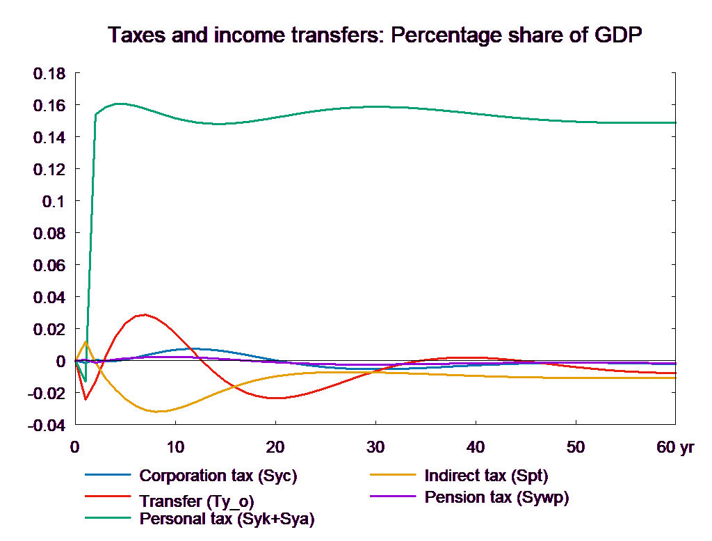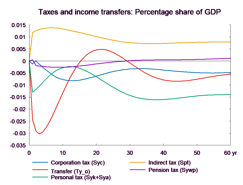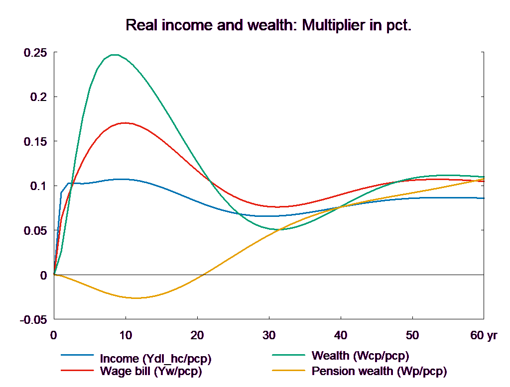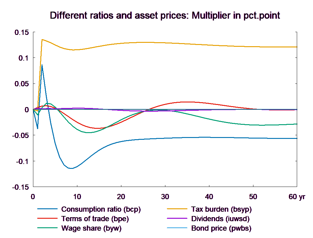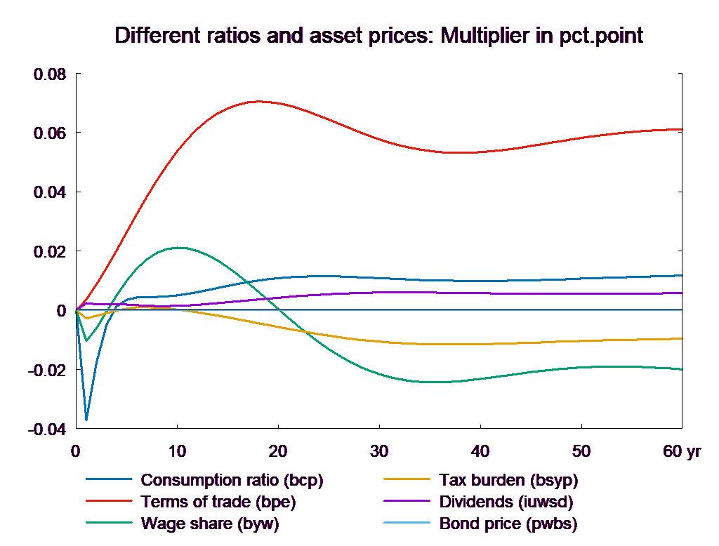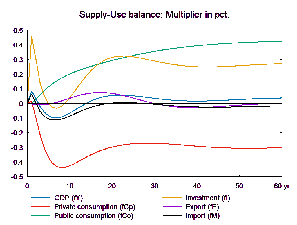 The higher public investment raises private sector production and employment in the short run. The income multiplier expands final demand more than the initial change in investments.▼ In Keynesian economic theory, the income multiplier refers to the final change in income as compared to the injection of capital deposits or investments which originally fueled the growth. It is usually used as a measurement of the effects of government spending on income. In the present experiment, the income multiplier can be seen as the ratio between the effects on final demand and the change in government investment in buildings.Compared to the government purchase of goods and services experiment, the effect on the domestic economy is larger because the import content of building investments is low. In the medium term, the higher employment increases wage growth and the wage-driven crowding out returns unemployment to its baseline in the long run.▼ The wage relation in ADAM is a Phillips curve, which links the changes in wages to unemployment. A fall/rise in unemployment pushes wages and hence prices upward/downward and reduces/improves competitiveness. So exports and production decrease/increase and over time unemployment returns to its baseline. This is the wage-driven crowding out process.