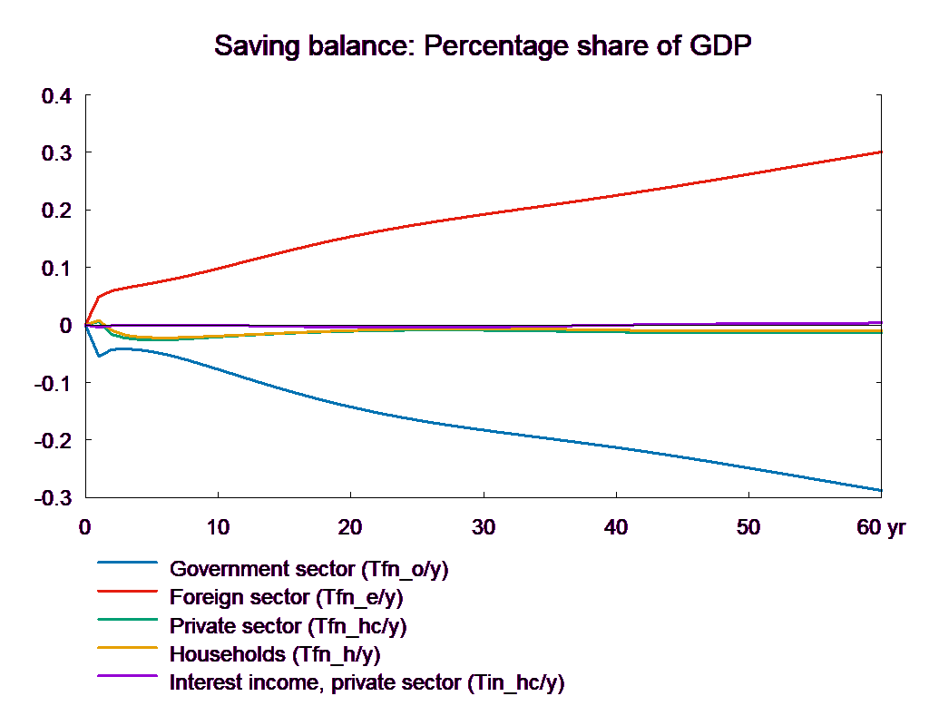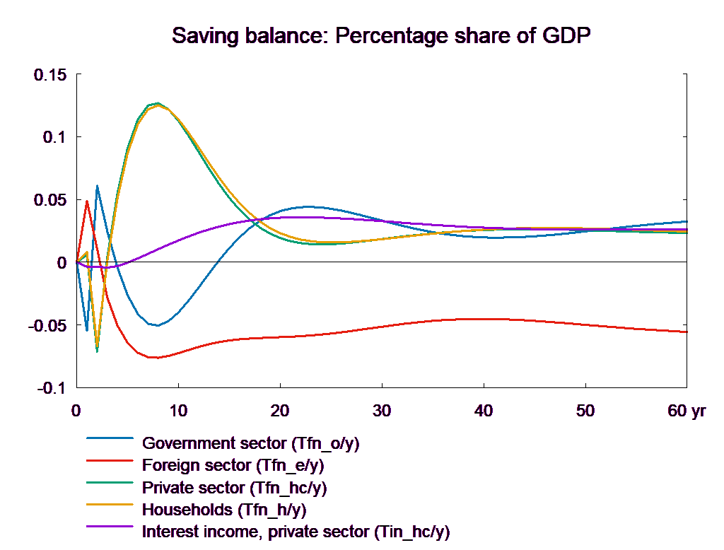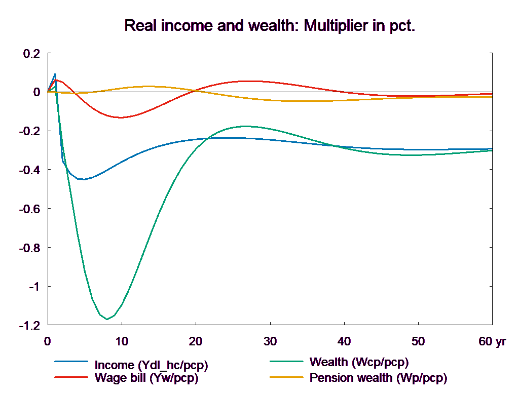 Private consumption increases permanently relative to the baseline due to the positive real wage effect.▼ Real wage effect arises because wages increase/decrease more than the general price levels due to the deadweight from the non-responding exogenous import prices. This creates a positive/negative real wage effect and real disposable income and private consumption increase/decrease permanently.