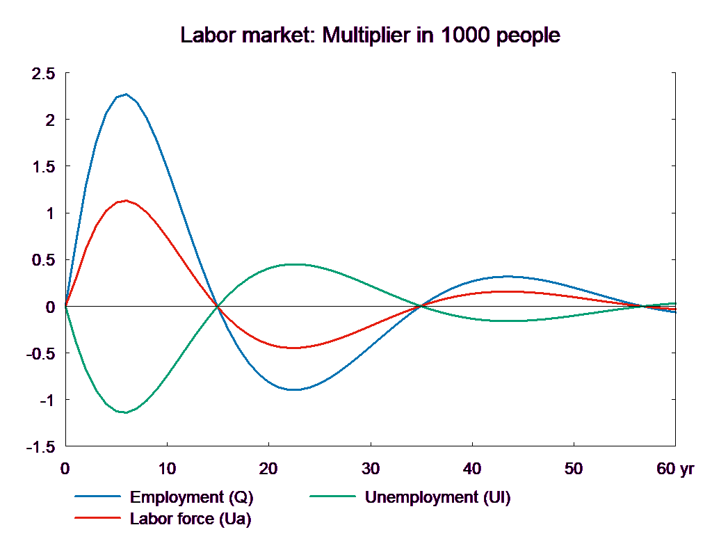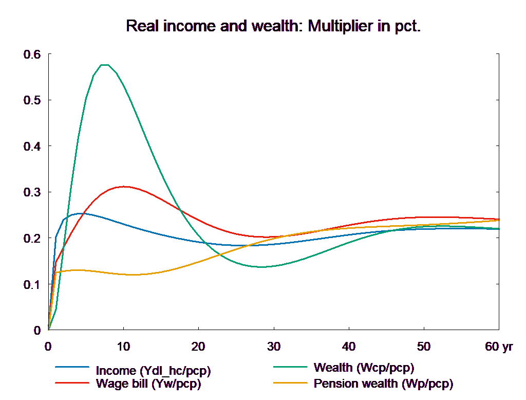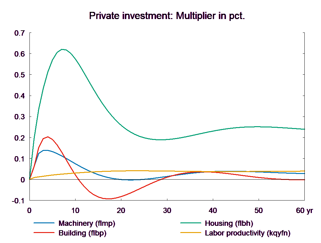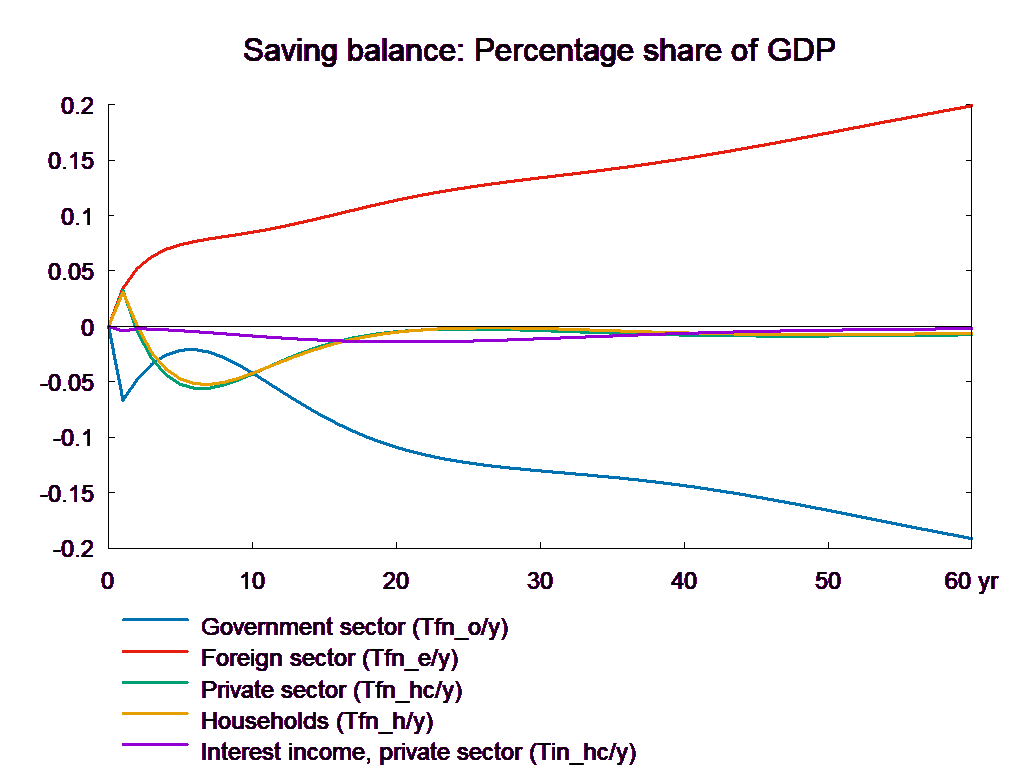 Note that there is no VAT on house price. But, there is a negative first year effect on house price. This is because the house price equation determines the real house price – nominal house price divided by consumption price – and the latter falls as VAT rates fall. In the following years the increased demand stimulates house price but in the long run the house price effect is slightly negative reflecting that the supply price, the housing investment deflator, does include VAT. In general, the VAT experiment resembles the direct tax experiment, but there are some differences, for example, there is an immediate positive impact on service exports as the lower consumer price stimulates the fixed-price purchases of foreign tourists. Just like the fall in direct taxes, the reduction in VAT deteriorates the public balance permanently.