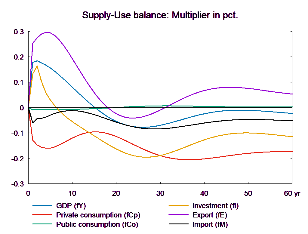 The response of exports to the competitive gain peaks gradually, due to among others capacity constraints and lack of inventory. This is captured by an error correction mechanism, and is one of the key features of ADAM. The effect on exports peaks after a few years. This reflects that the short-term price elasticity is lower than the long term price elasticity in the export equations, so that the error correction process makes the initial response in exports less than the response in the following years. After reaching a peak, exports declines as competitiveness deteriorates.