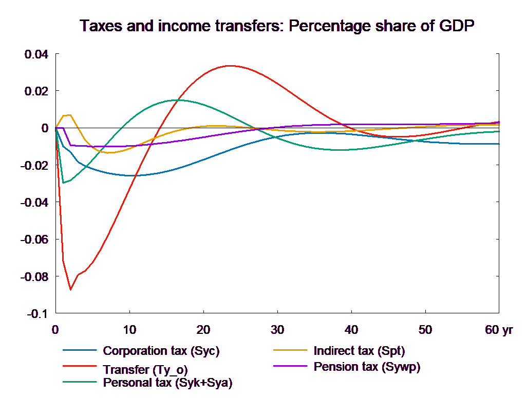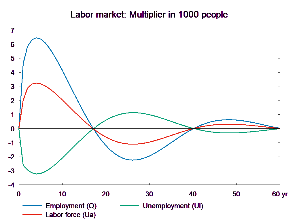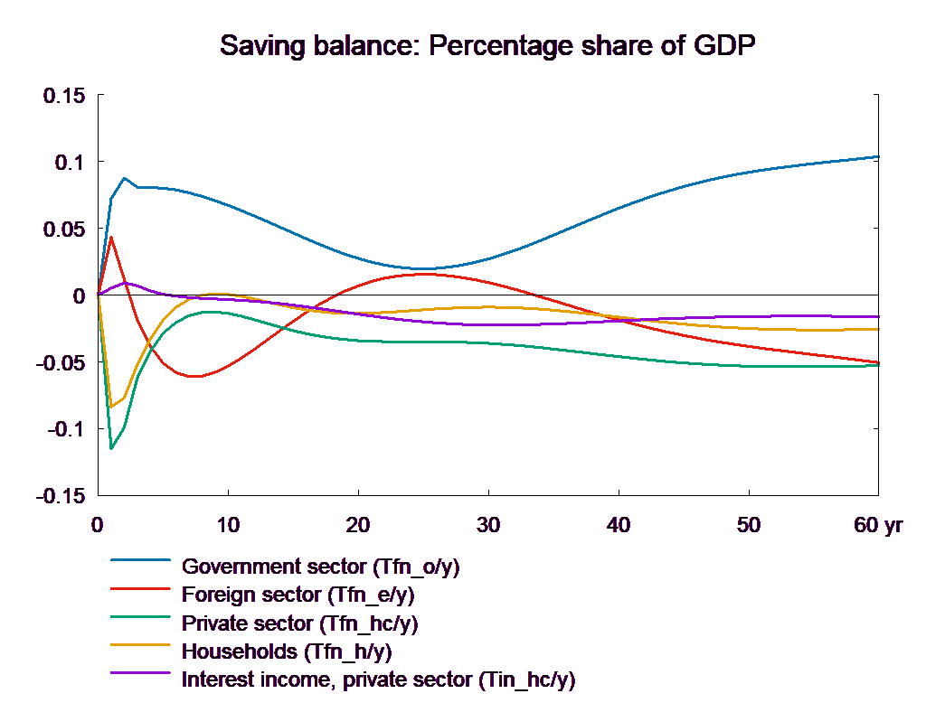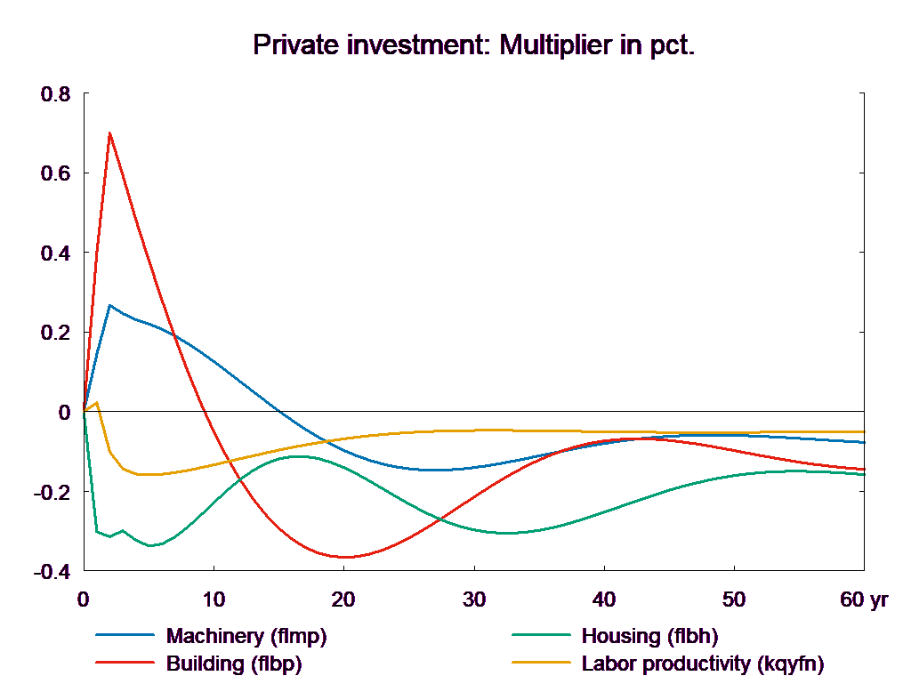 There is an immediate positive impact on imports despite the increase in import prices. The higher import prices reduce imports, but the higher production requires more inputs, which are partly imported. The short-term demand elasticities are relatively high in the import equations. Thus, the positive demand effect dominates and we get a net increase in imports in the short run. The higher production also increases investment in machinery and business buildings in the short run. The immediate effect on housing investment is negative, due to the fall in real income and housing demand. After the initial fall, house price and housing investment start a positive adjustment process as private consumption starts moving back to its baseline.