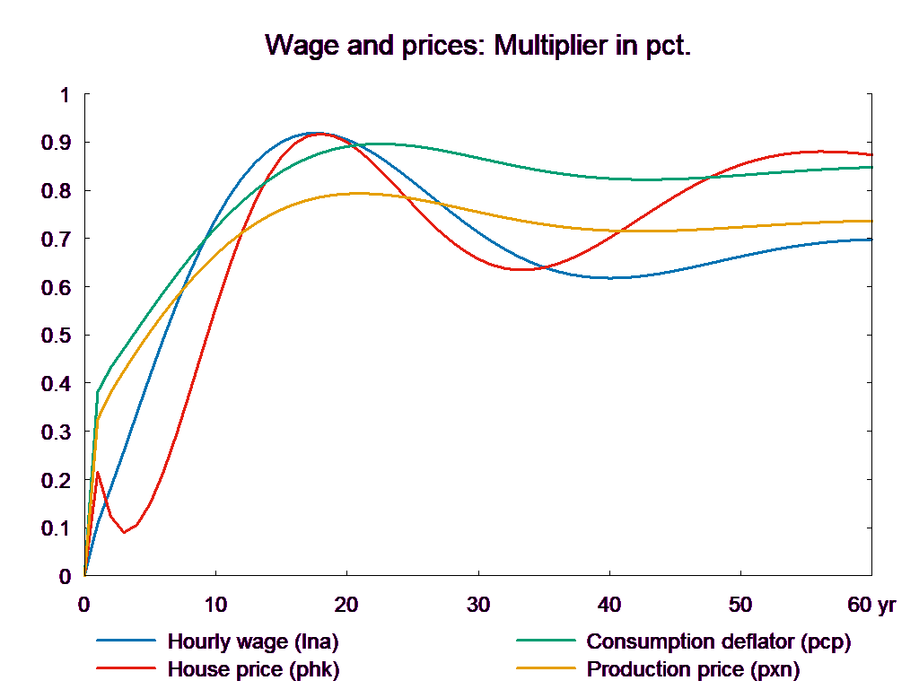 The table below presents the effect of a permanent 1 percent increase in foreign prices measured in Danish krone. (See experiment)