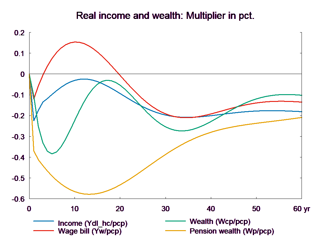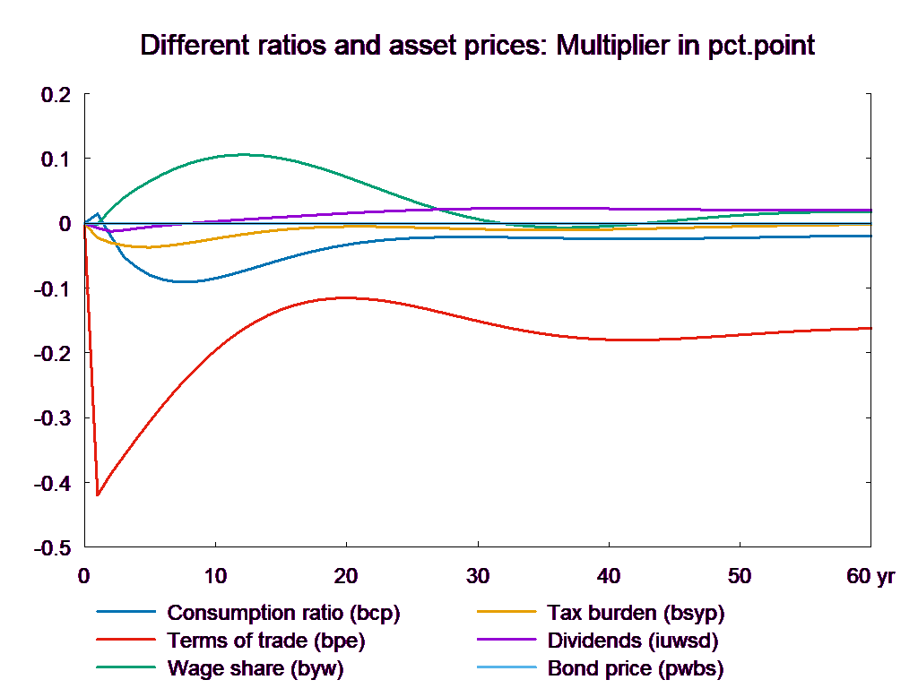 Note that the long-term effect of a permanent change in foreign prices and the long-term effect of a temporary shock to the wage relation, cf. section 17, are similar with respect to the absence of long-run effects on real variables. They are also similar with respect to the long-term effect on public and foreign debt. In both cases there is a long-run effect reflecting the accumulated budget effects in the transition period before equilibrium is reached. They are also quite similar concerning the adjustment process but note that the transitions differ with respect to sign. A temporary positive wage shock triggers a period with unemployment above baseline, while a permanent foreign price increase triggers a period with unemployment below baseline.